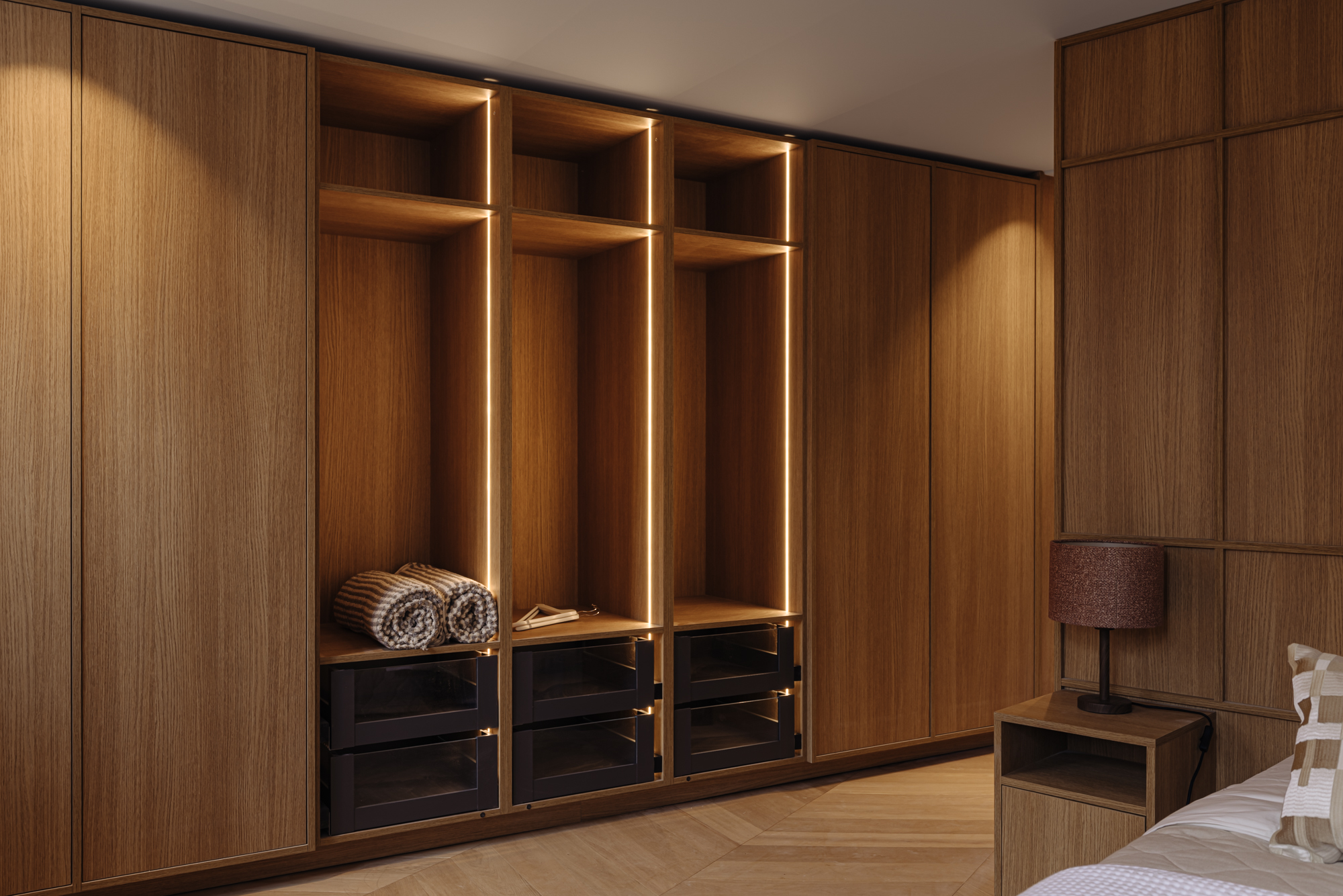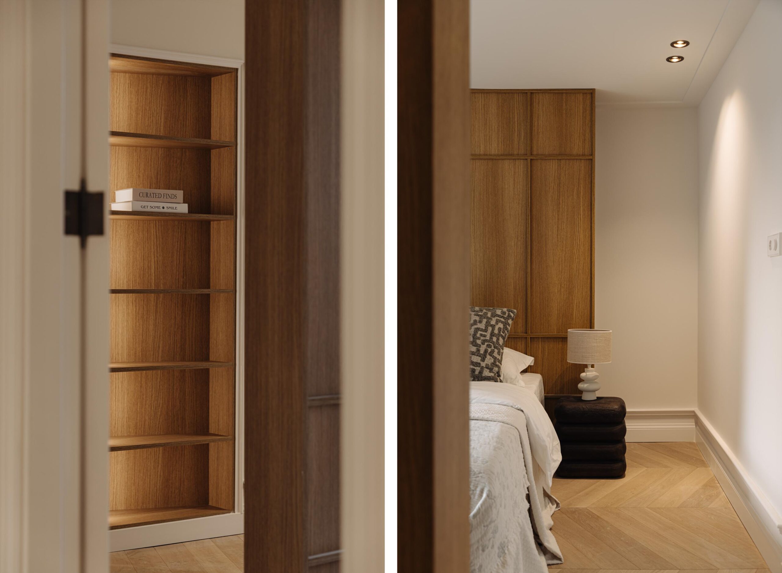 The lower ground floor is arranged as a comfortable sleeping level. At the front is the spacious master bedroom with built-in wardrobes and an en-suite bathroom featuring a walk-in rain shower and double washbasin. At the rear is the second large bedroom, also with its own bathroom equipped with a walk-in shower and washbasin. From this room, there is access to the attractively landscaped rear garden of approximately 18 m². A separate toilet is accessible from the hallway. In addition, the landing provides access to an internal storage room with connections for a washing machine and dryer.
