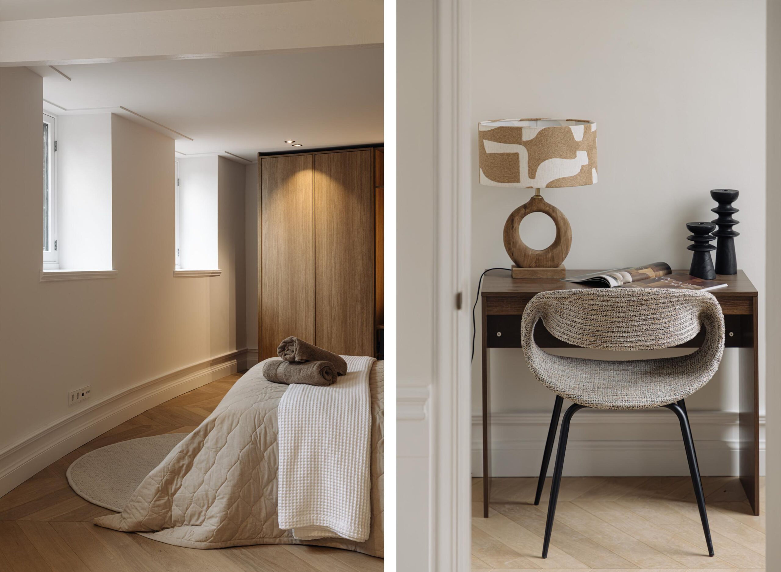 The monumental staircase leads to the landing of the first floor. At the rear is the classic dining room with access to a second internal balcony. This balcony features a folding glass façade, seamlessly connecting indoor and outdoor living. Thanks to its favourable position, you can enjoy the sun here well into the evening. At the front is the spacious kitchen-diner with cooking island—without doubt the centrepiece of the home. The kitchen is finished in beautiful dark oak and complemented by an elegant composite worktop. It is equipped with high-end Siemens StudioLine appliances, a Bora cooktop, and a Quooker tap. The island also features a welcoming bar area. With a width of nearly 7 metres and three large windows, the kitchen enjoys wonderful open views towards Jan Luijkenstraat. From both the kitchen and the landing, the fourth (bed)room can be accessed, which is ideal as a home office or study.