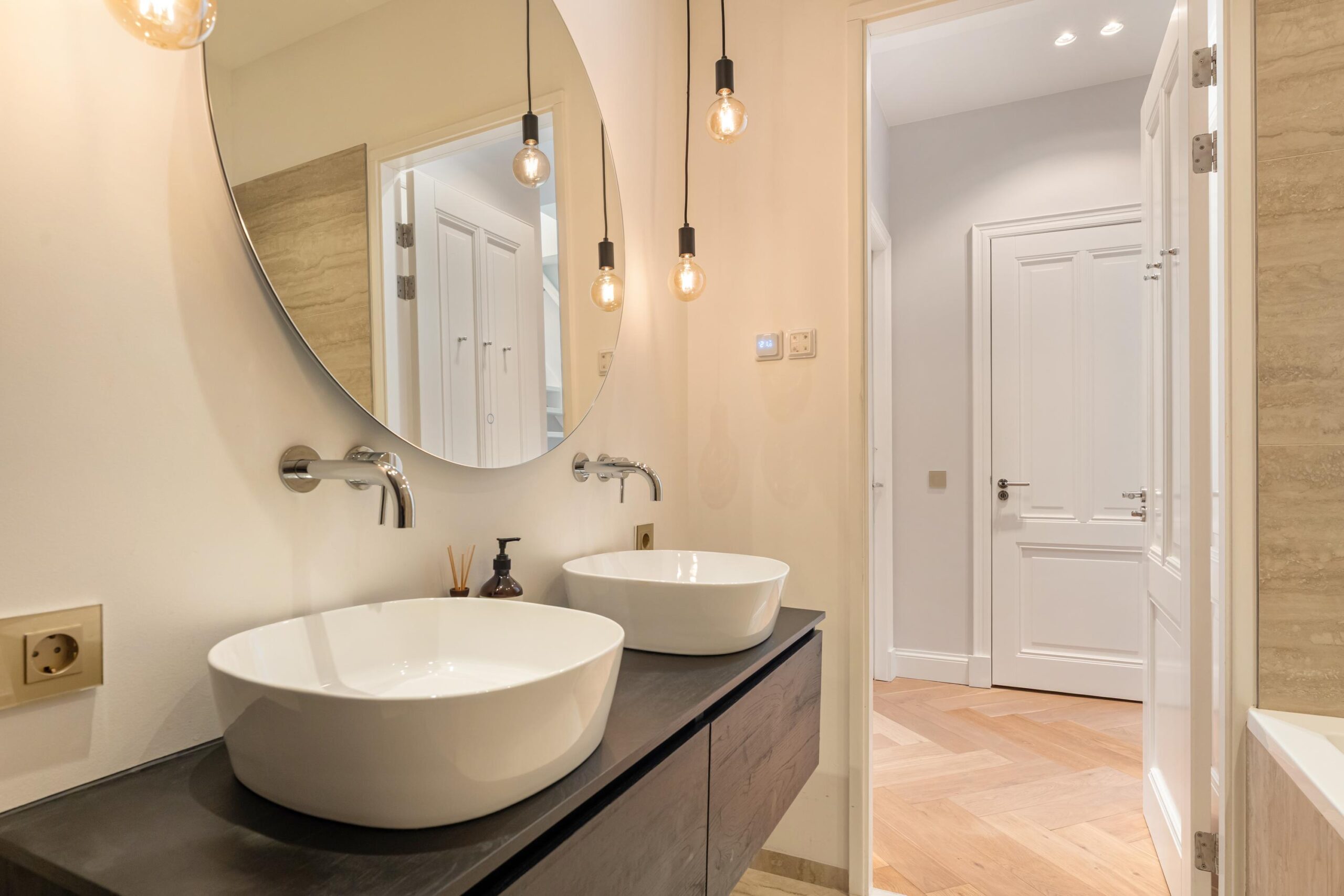 No expense has been spared during the renovation, with high-quality materials used throughout the luxurious finishes. The entire apartment features an oak herringbone floor with underfloor heating and elegant high skirting boards. All rooms are fitted with recessed spotlights, wall lighting, and decorative mouldings.