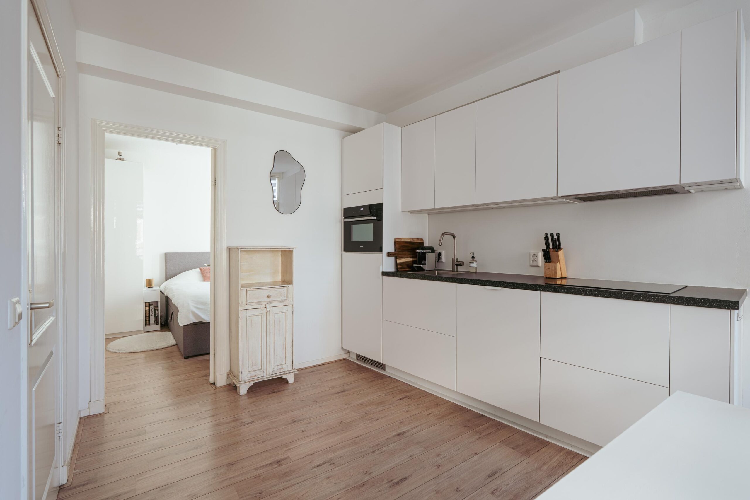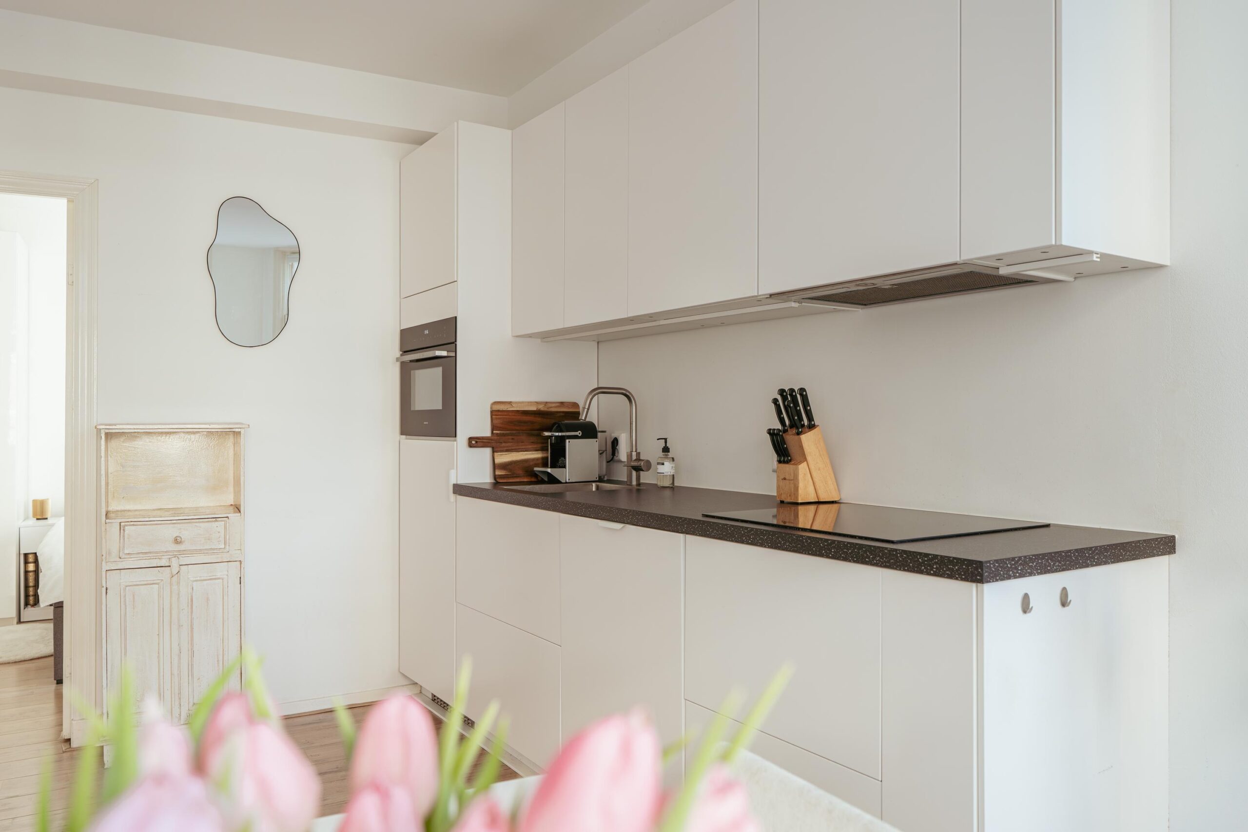 The open kitchen was completely renovated in 2024 and features a modern layout including a tall pull-out pantry cabinet, an induction cooktop with extra boosters, a new dishwasher with automatic shut-off function, a combi oven, and a refrigerator.