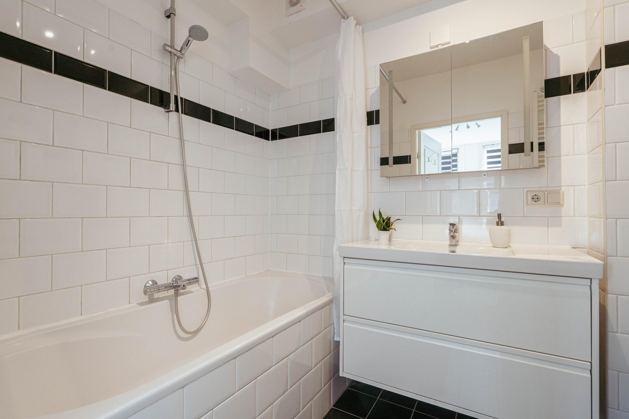From the living room, you access the bedroom, which also enjoys plenty of natural light through its large windows. Built-in wardrobes on both sides provide ample storage space. The bathroom is en suite to the bedroom and includes a bathtub with shower, a vanity unit with sink, and connections for a washing machine and dryer.