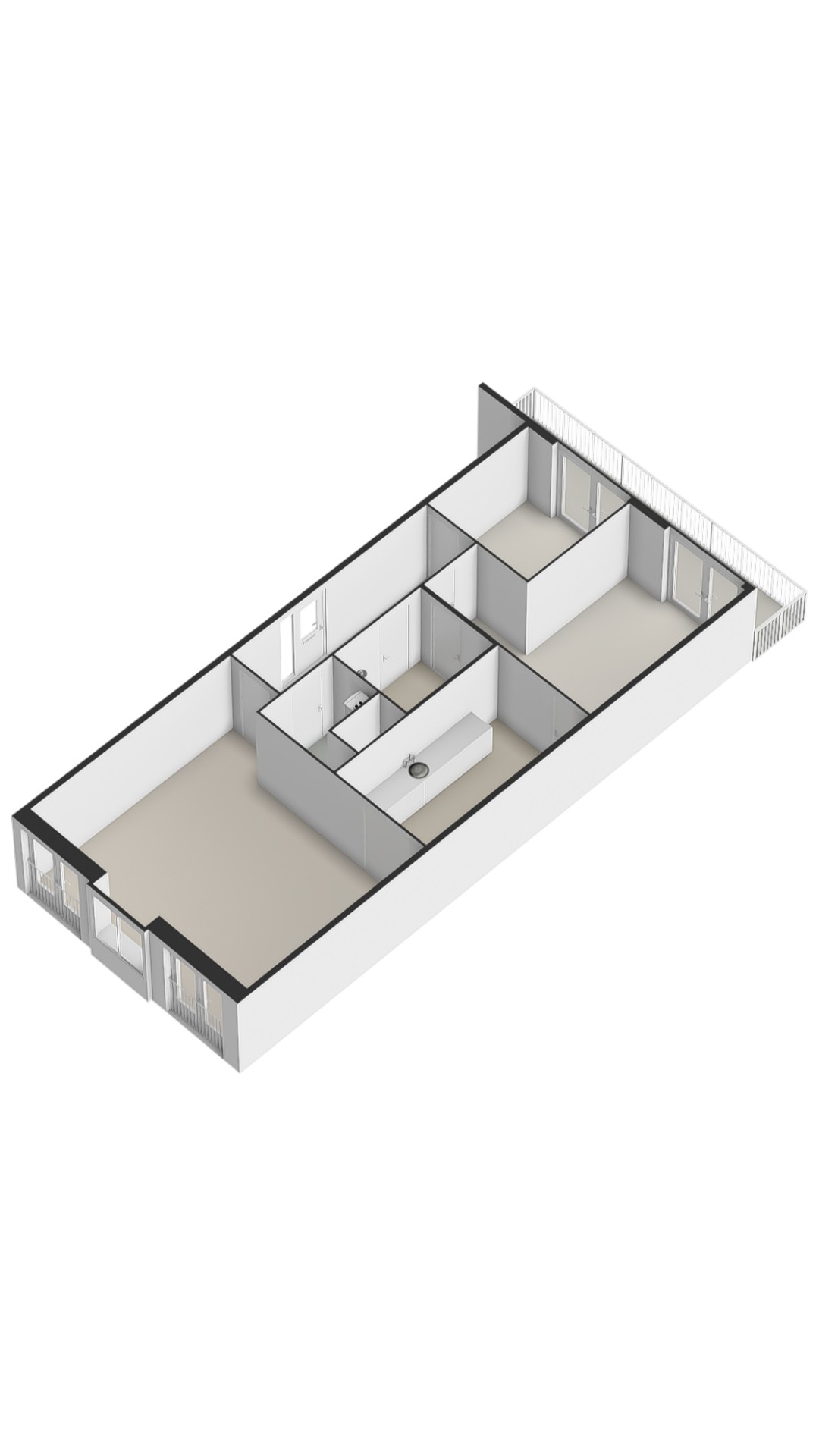 Upon entering the apartment on the third floor, you arrive in a spacious and light hallway providing access to all rooms. At the front of the apartment is the generous living area, which benefits from exceptional natural light thanks to two French balconies and an additional large window. A sliding door leads to the centrally located kitchen, fitted with a 5-burner gas hob with extractor hood, wide oven, dishwasher, sink and ample space for a fridge/freezer combination. From the kitchen, you continue to the rear-facing master bedroom, which offers direct access to the wide balcony of approx. 12 m², stretching across almost the entire width of the apartment. The balcony can be accessed through double French doors. The bathroom is en-suite to the master bedroom and also accessible from the hallway. It is equipped with a walk-in shower, toilet and washbasin with vanity unit. The second well-sized bedroom, located next to the master bedroom, also provides access to the balcony through double French doors and is accessible via the hallway.