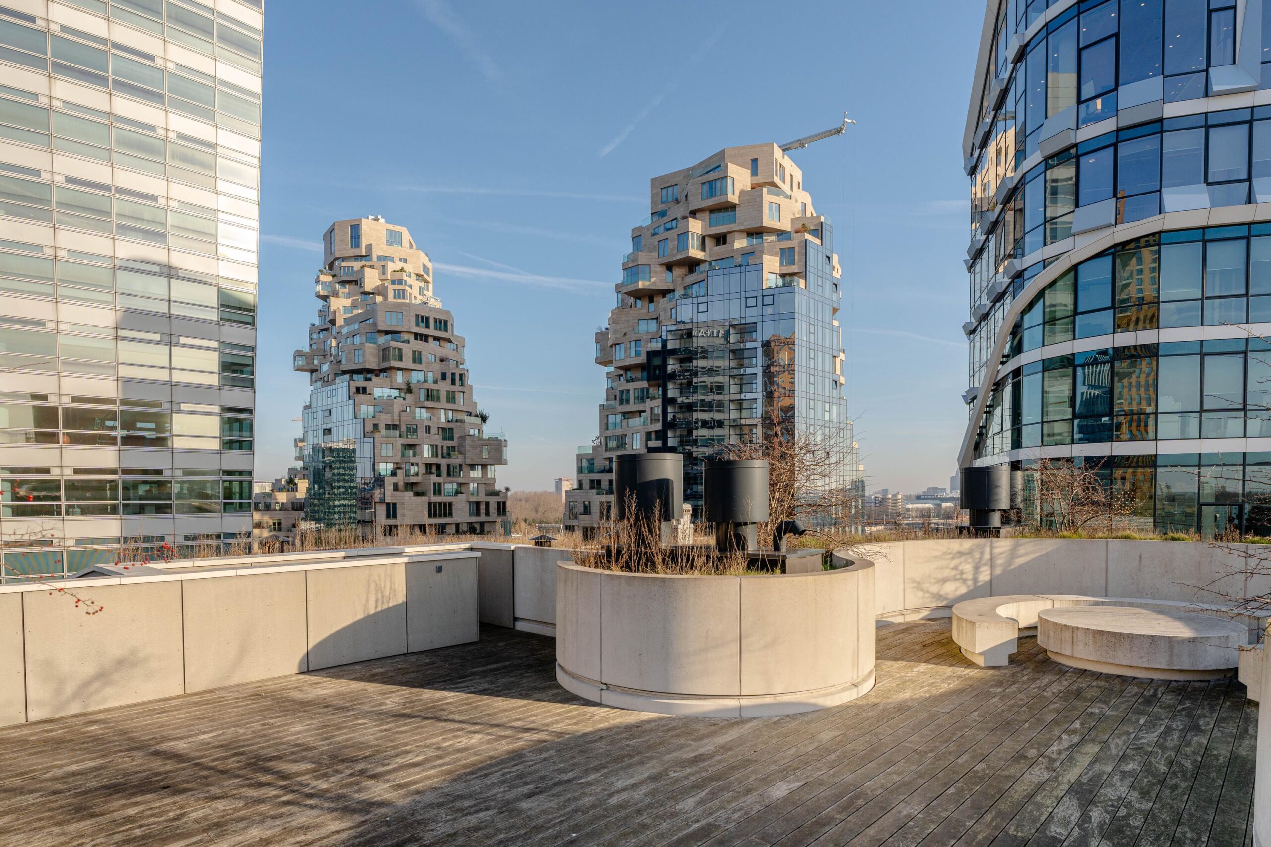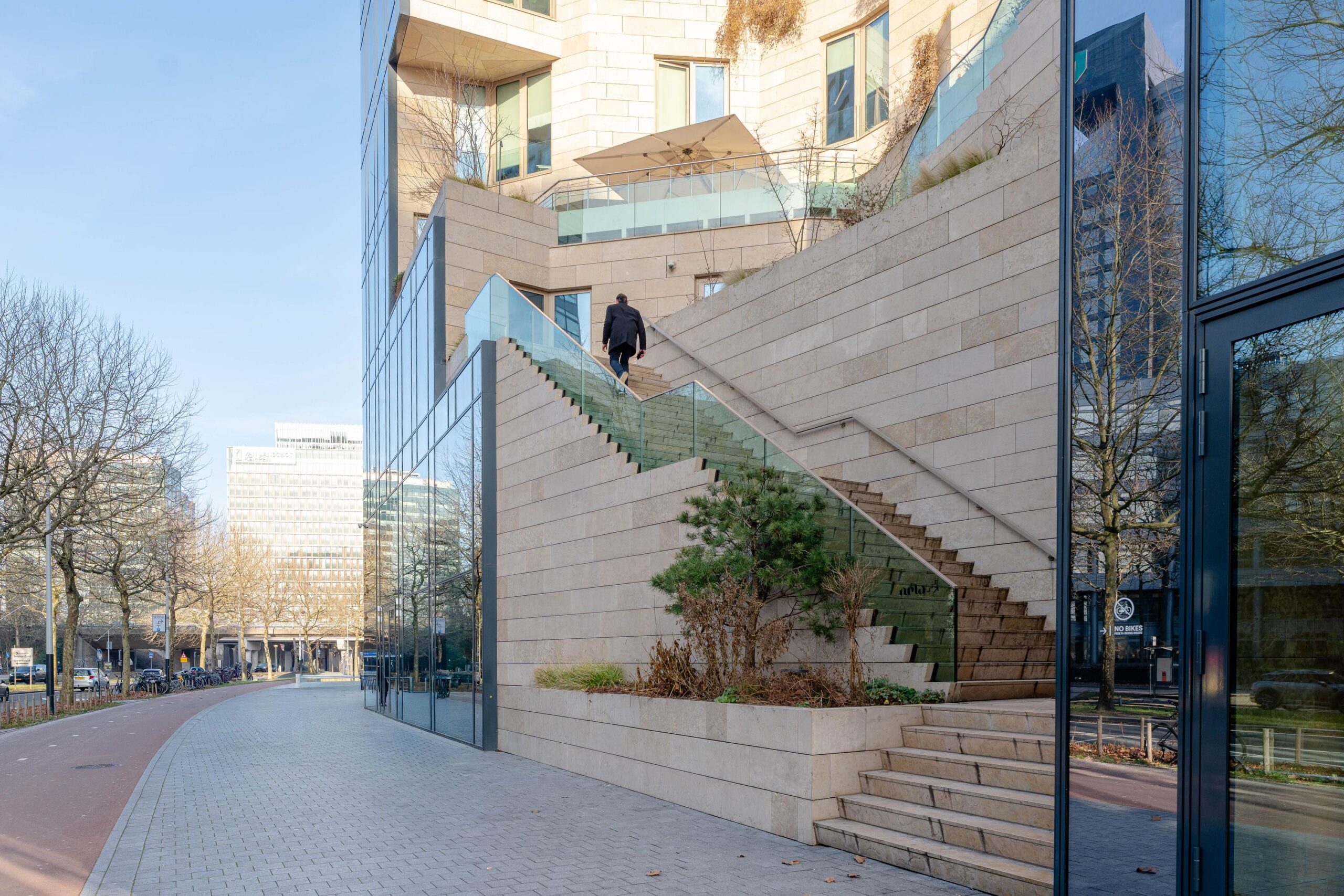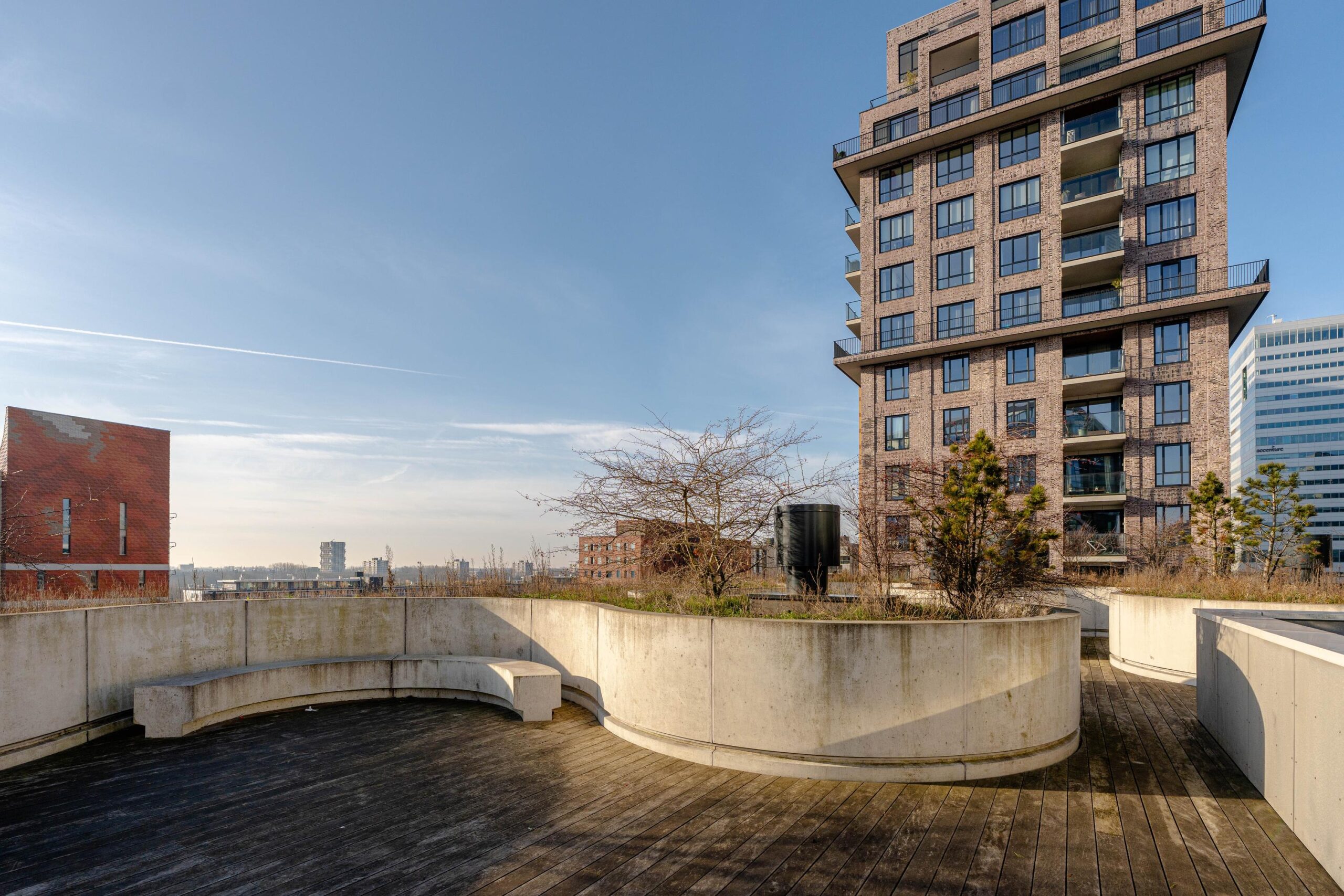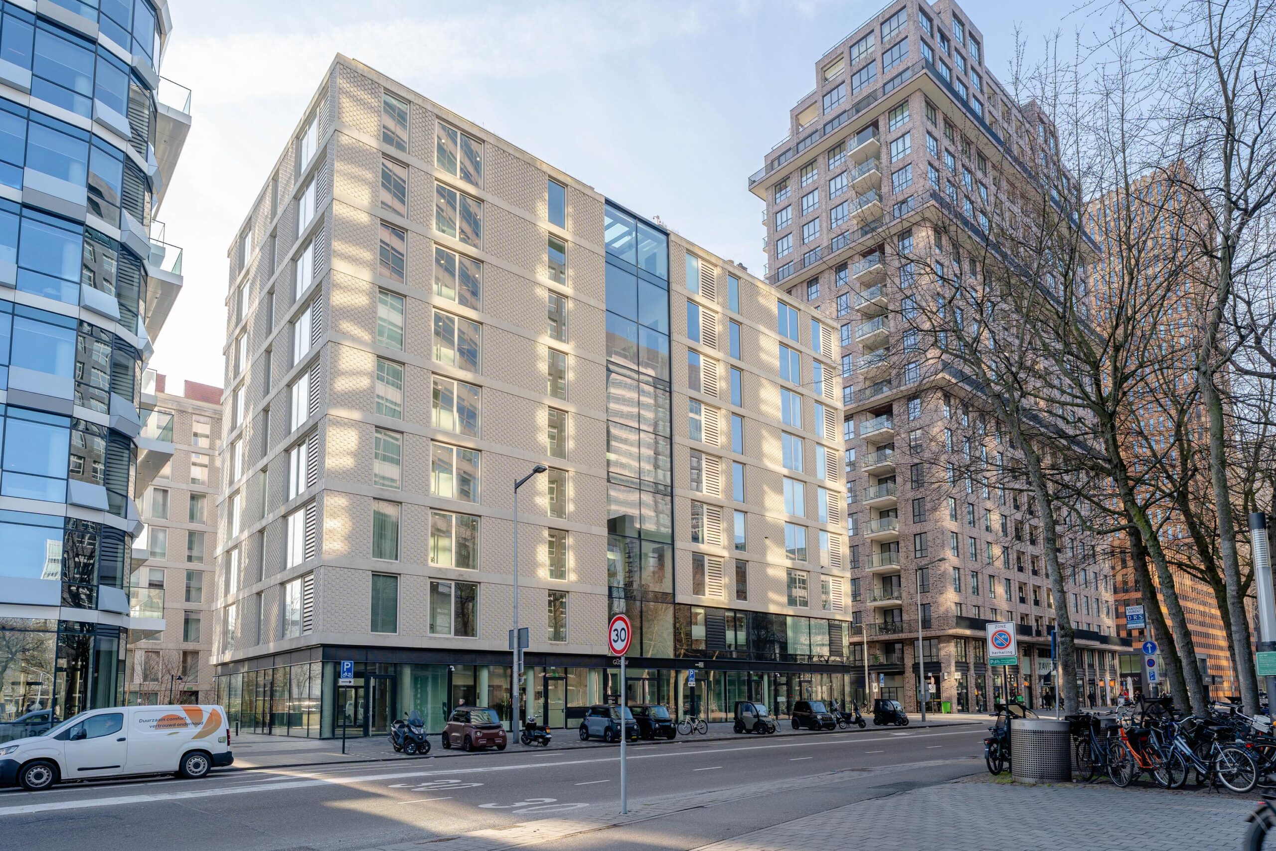 The Gustav is a sustainable apartment complex with many green and future-oriented amenities. The project offers comfortable living in the Zuidas area, with a strong focus on shared spaces. The building features a communal rooftop garden and several co-working areas within the complex, encouraging social interaction and connection. On the ground floor, there are various retail and dining spaces. Beneath the building, parking facilities for cars are available, as well as an indoor bicycle storage area.