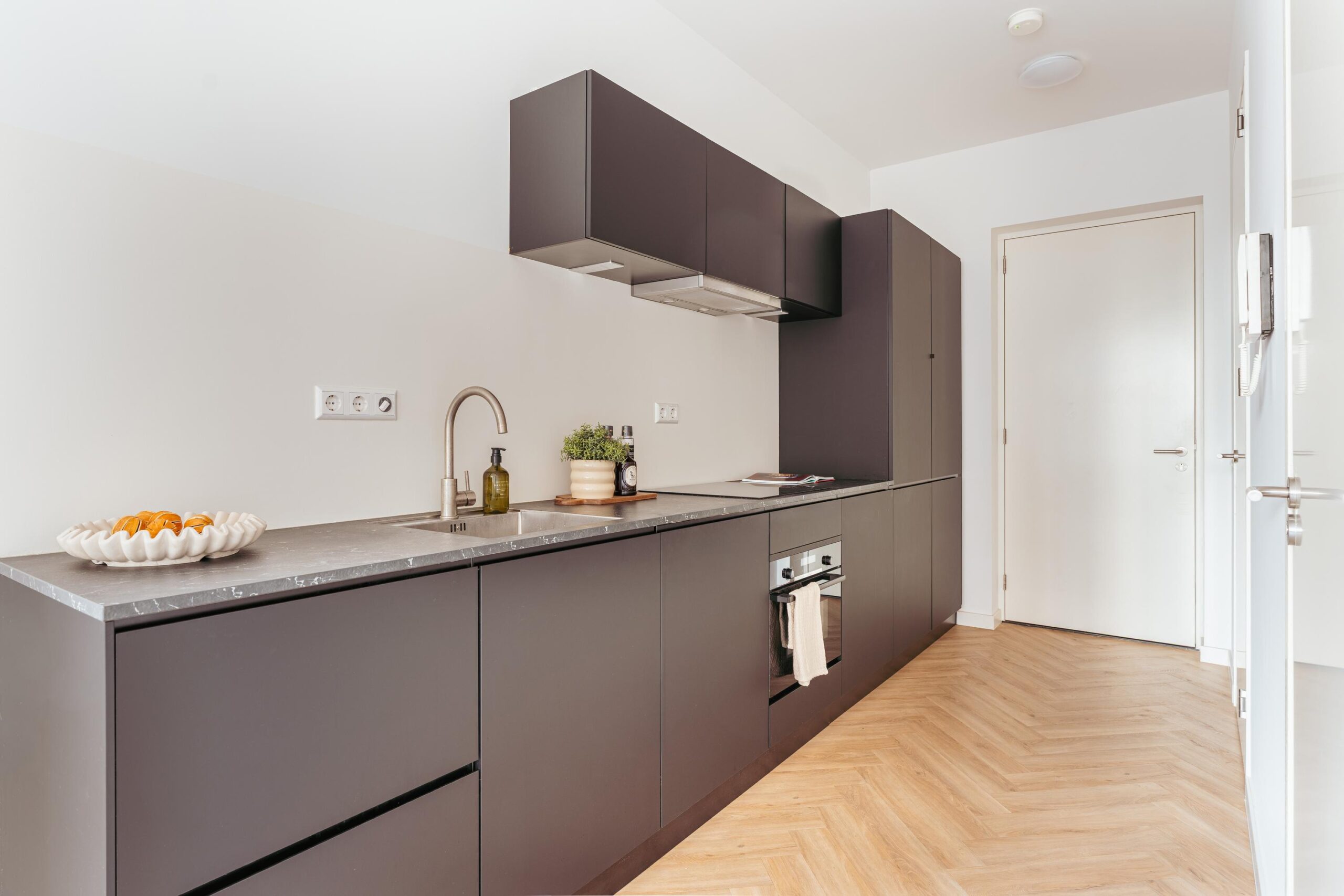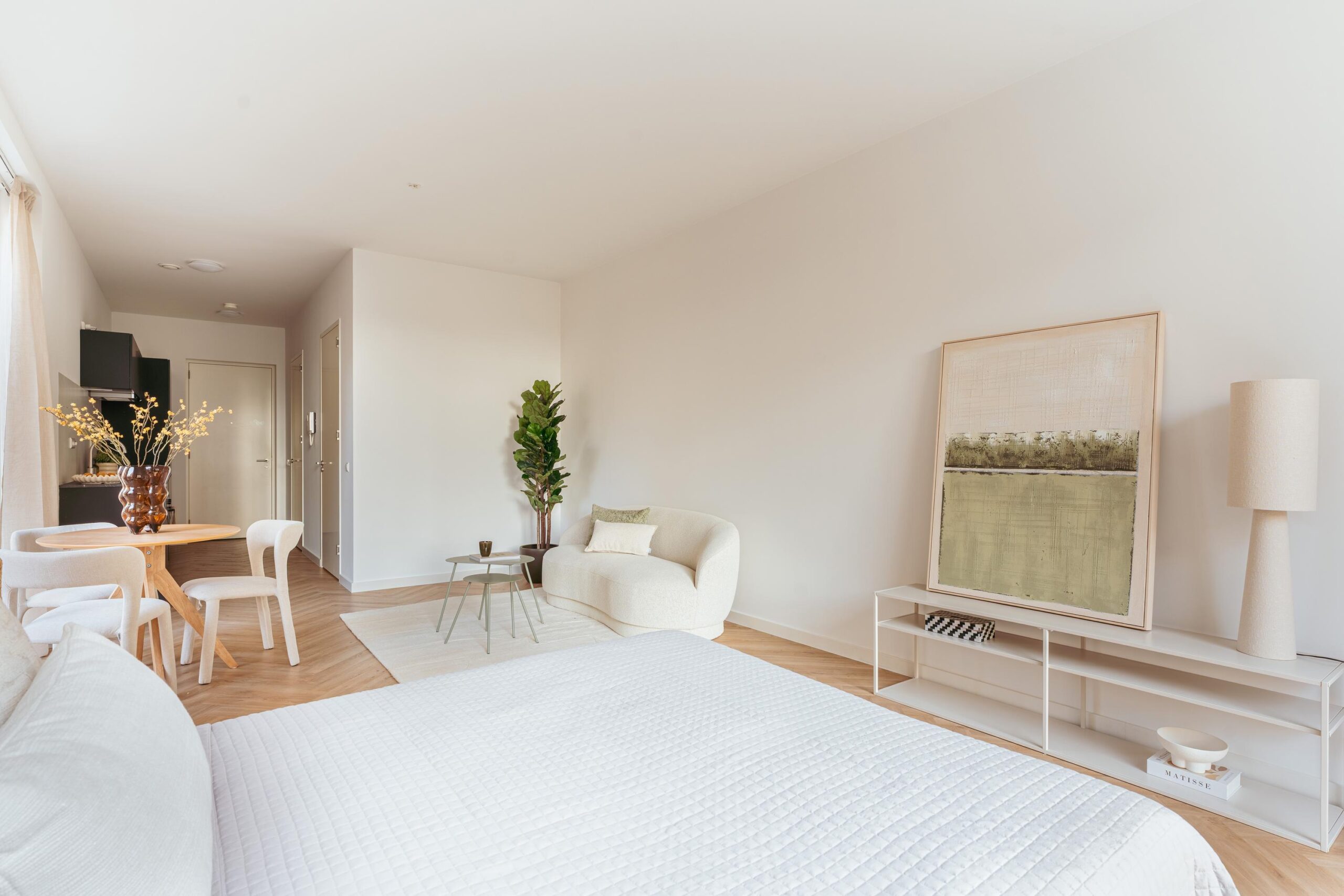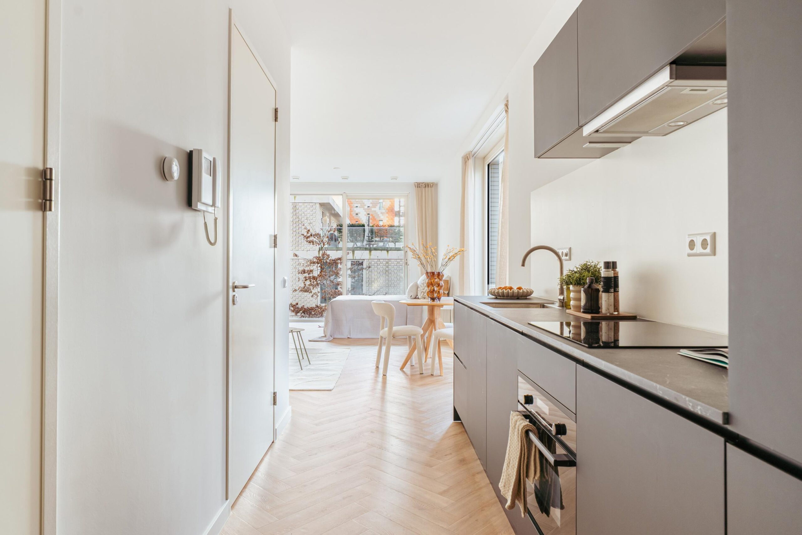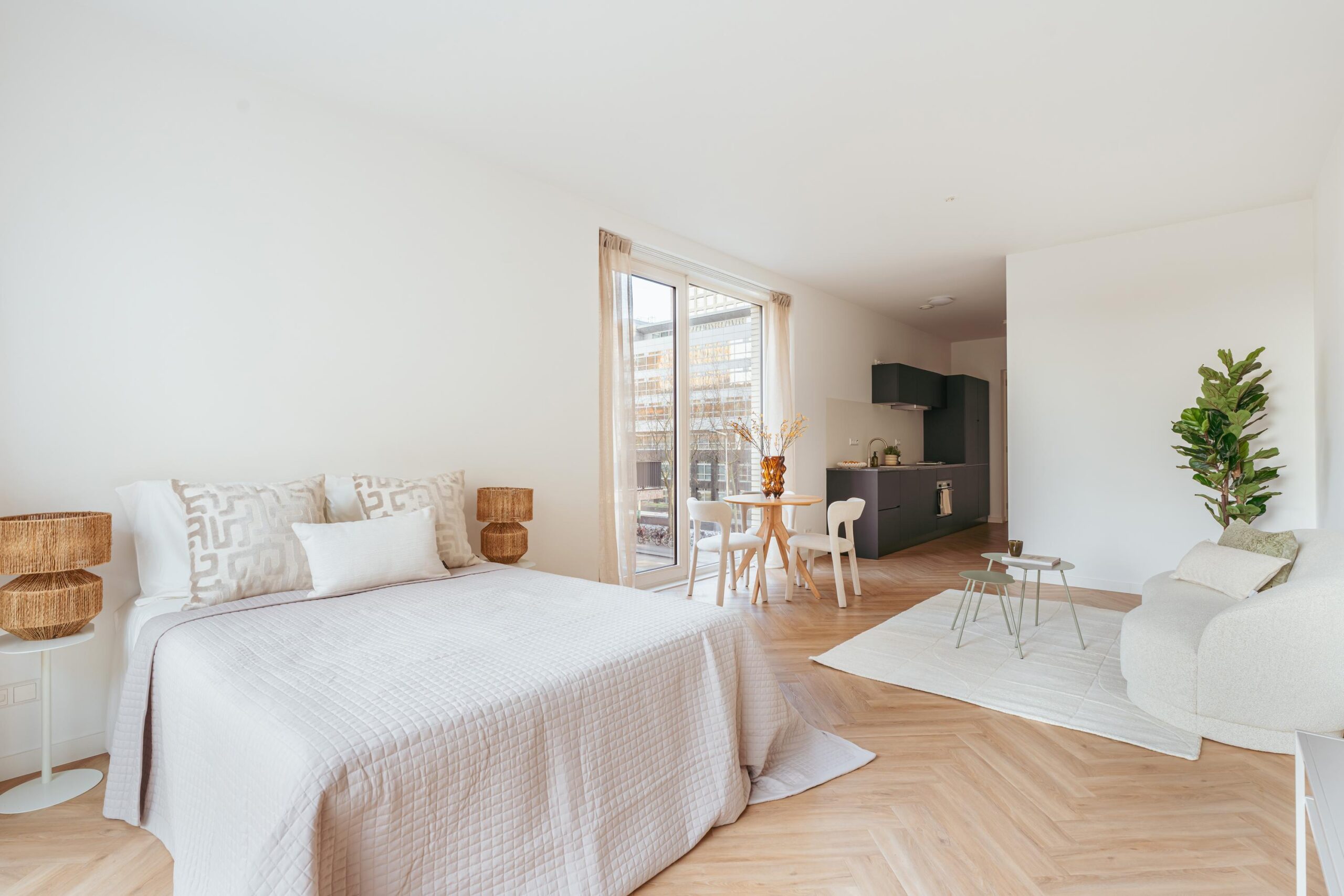 The kitchen is fully equipped with a refrigerator, freezer, induction hob, extractor system, dishwasher, and a combination oven. The studio features two large windows, which, together with the corner location, provide abundant natural daylight and the possibility to ventilate during the summer. There is ample space for a comfortable sleeping area, seating area, and dining area.