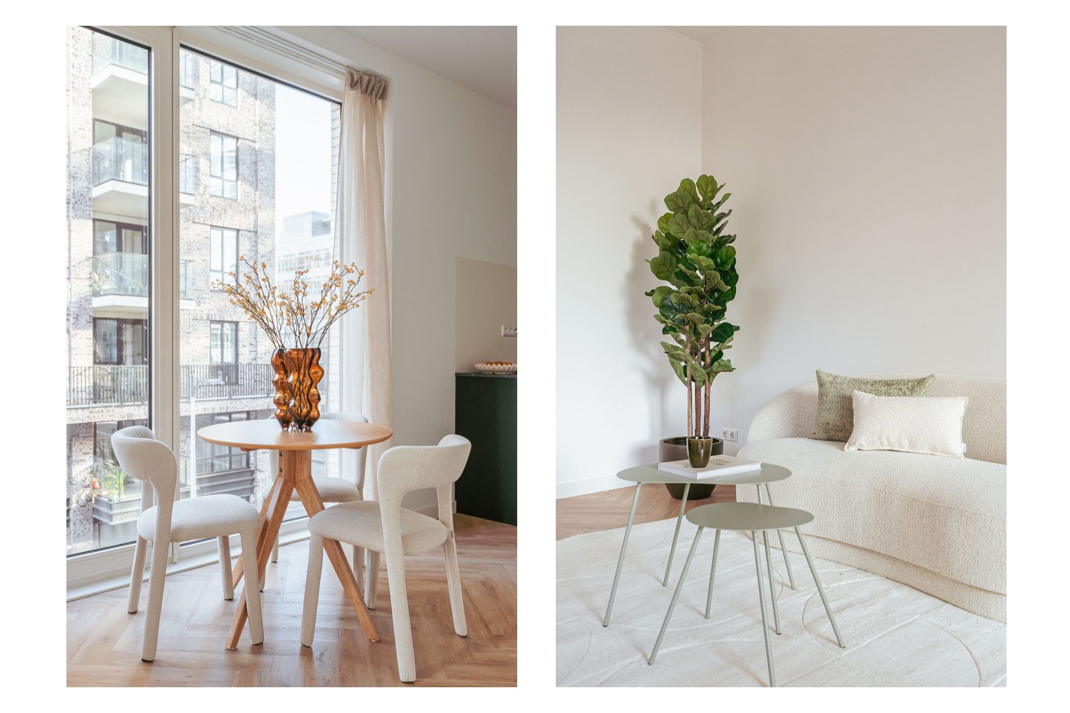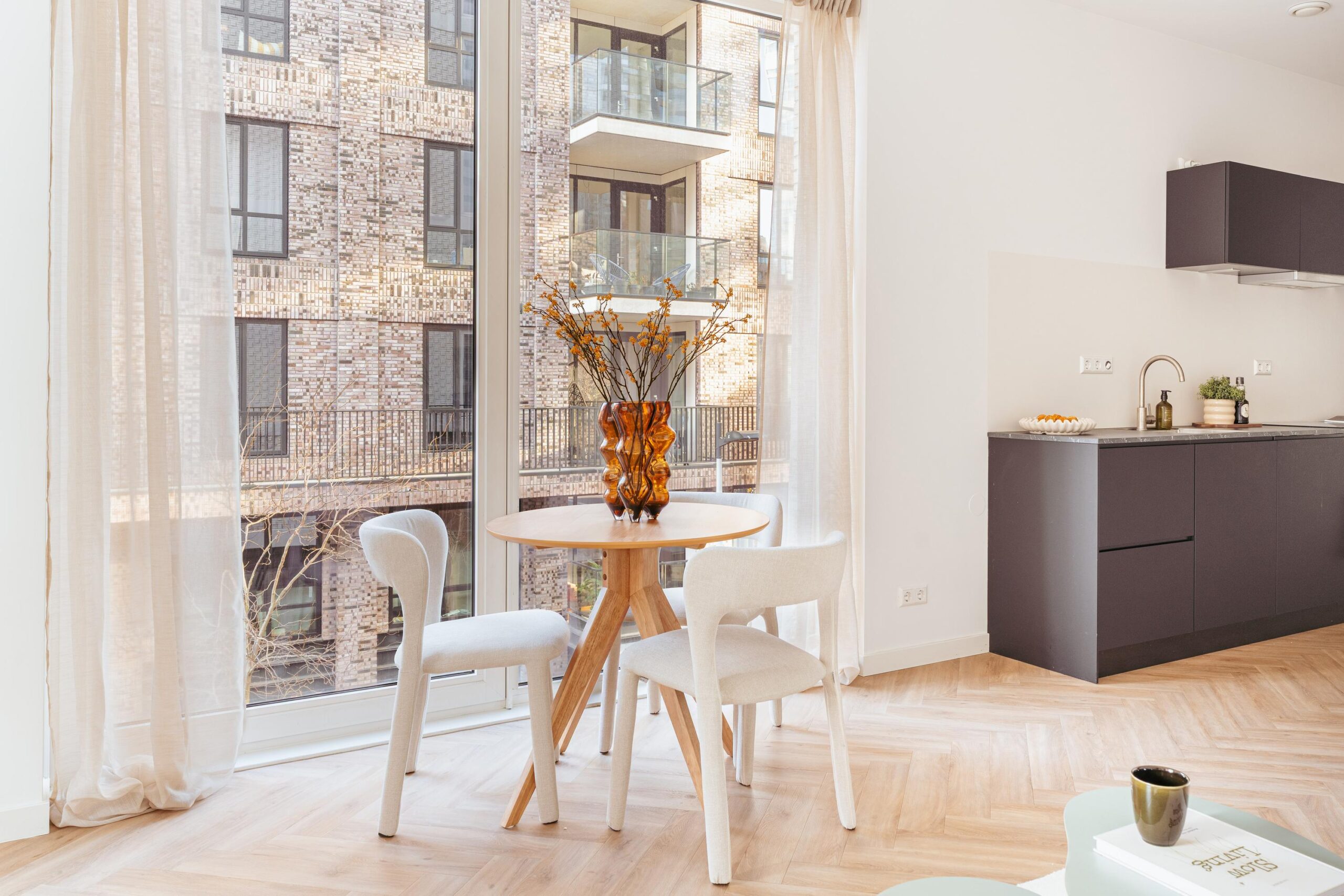 This corner apartment is located on the second floor and can be reached by elevator. Upon entering, the kitchen immediately offers a view of the entire apartment, with the striking glass window façade at the rear drawing attention right away, creating an open and spacious atmosphere.