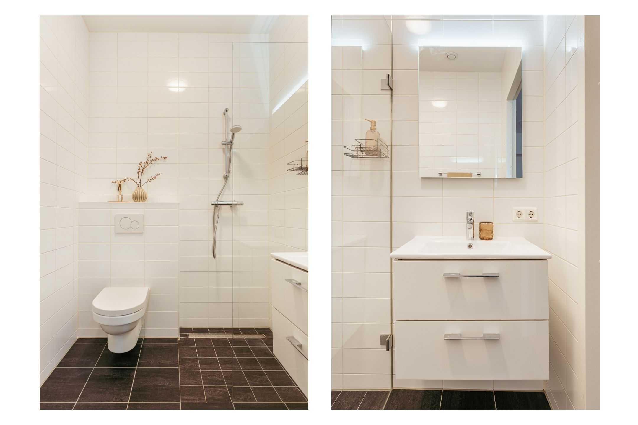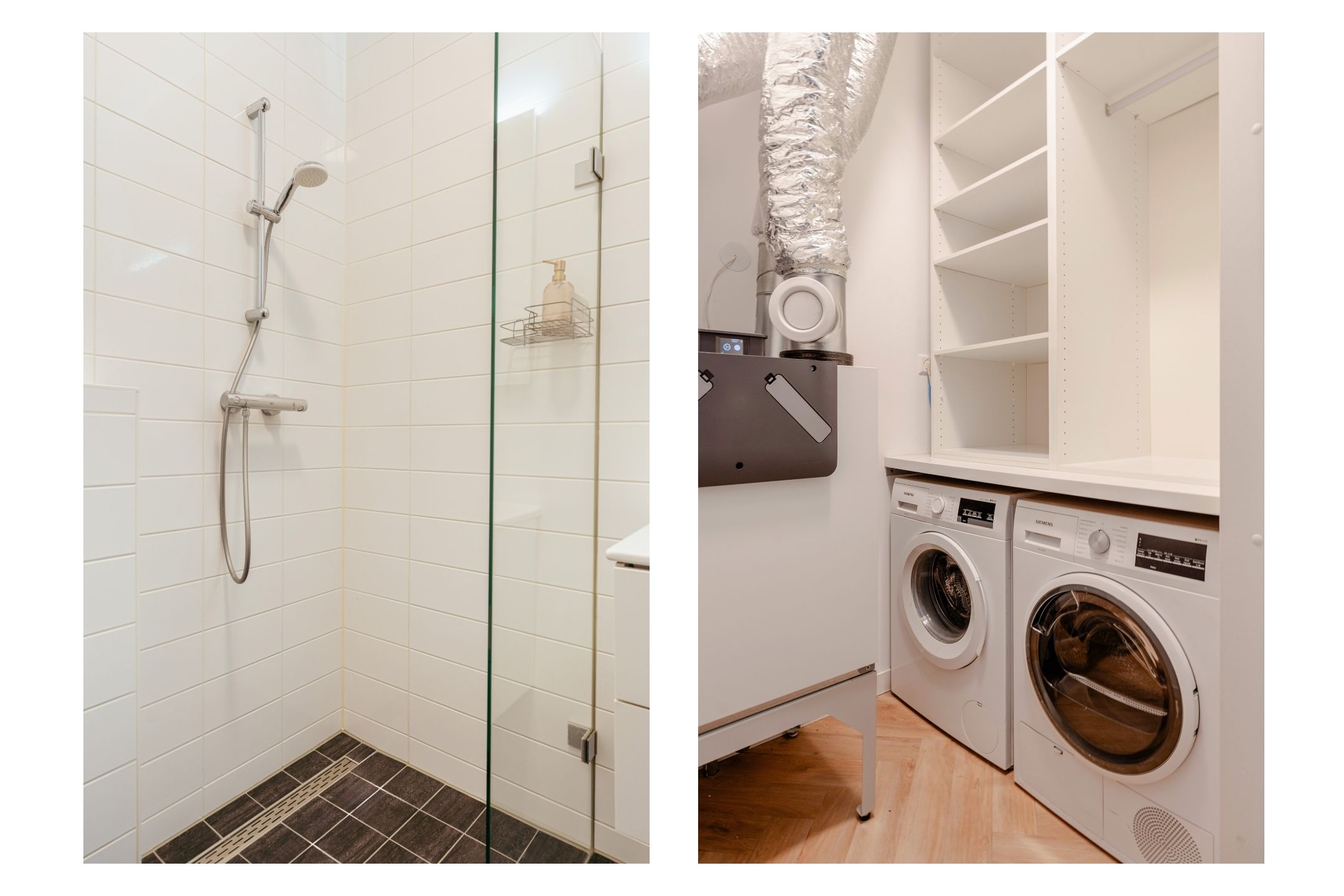 The bathroom is fitted with a toilet, walk-in shower, and washbasin with vanity unit. Additionally, there is a separate storage room offering extra storage space and connections for a washing machine and dryer.