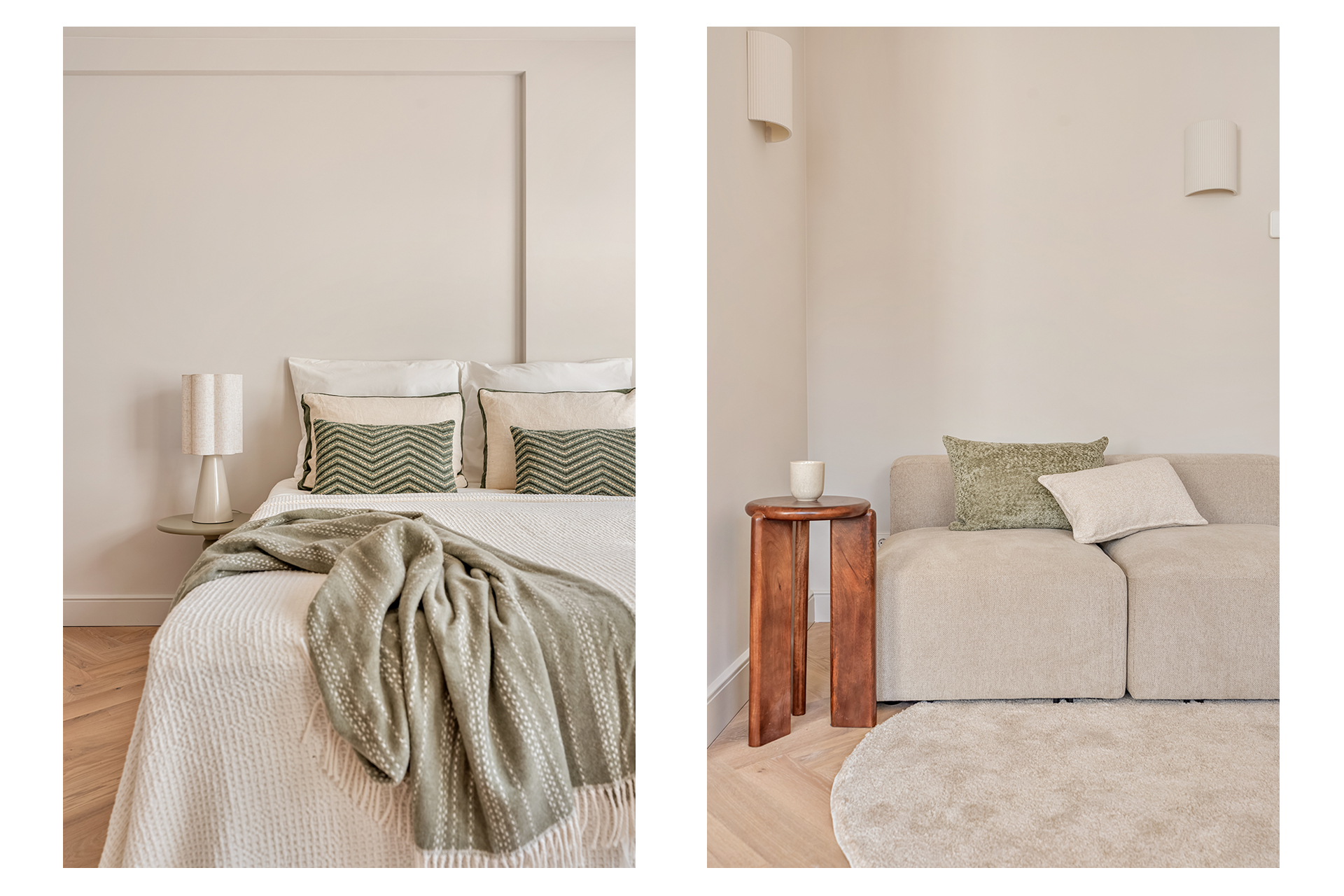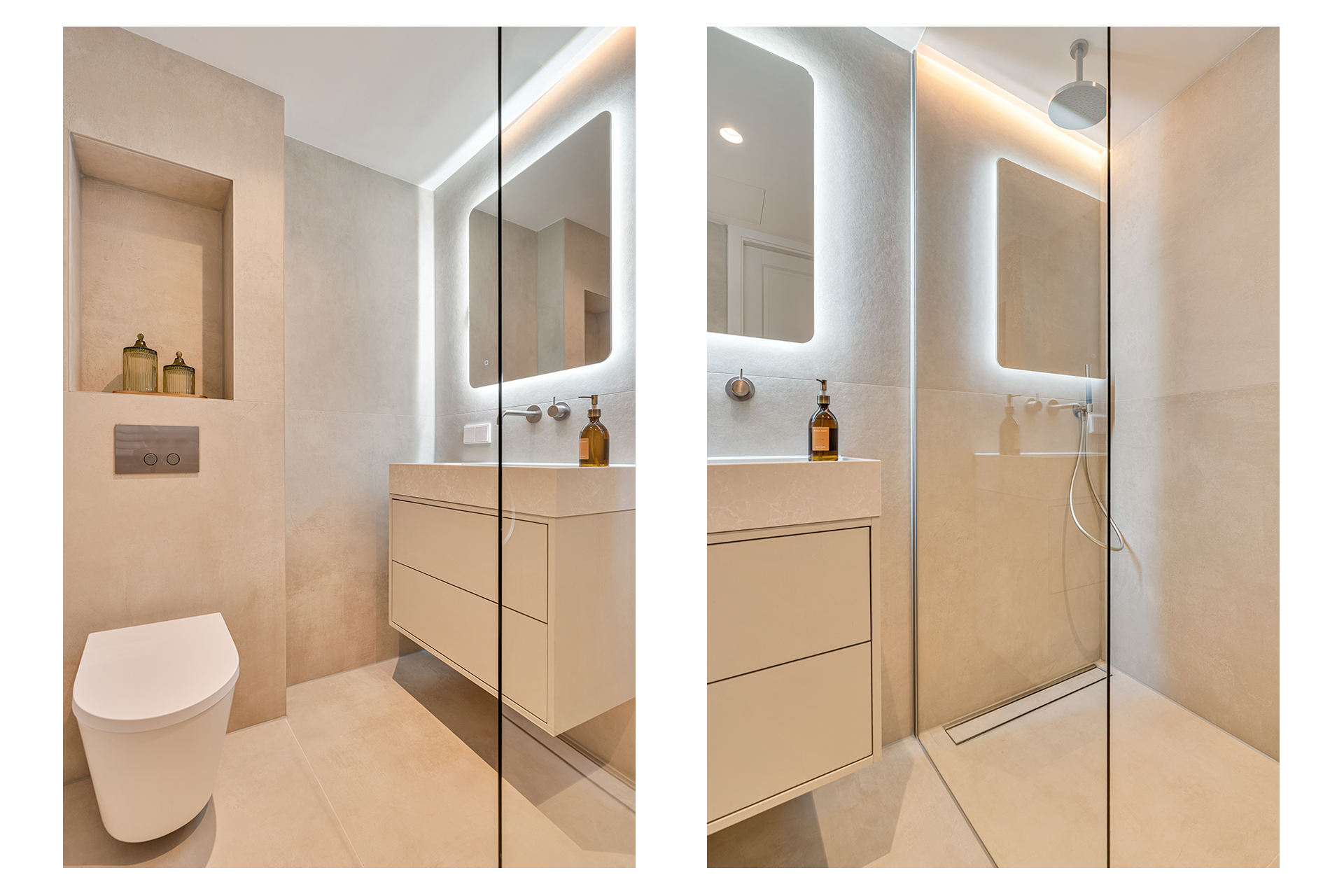 Upon entering, you step directly into the apartment’s living area. The open layout is immediately apparent and creates a sense of spaciousness. Thanks to the wide windows at the back, the space enjoys plenty of natural light.