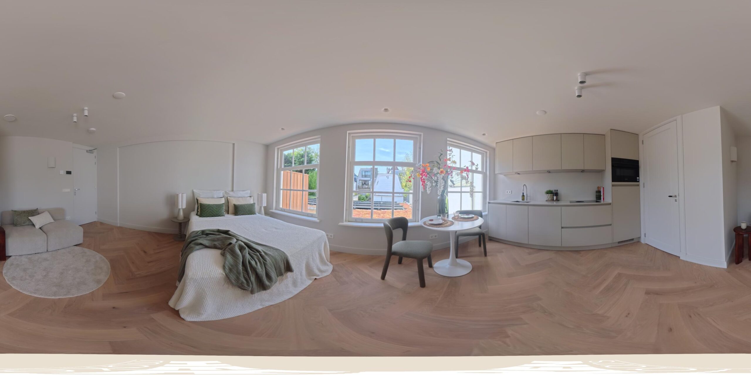 The living room and sleeping area are combined into a single open space, with ample room to create both a comfortable seating area and a sleeping area. The efficient and slightly deeper layout of the space offers excellent opportunities to logically separate the different functions. The open kitchen is situated along the wall and forms a practical whole with the living area. The kitchen features a composite countertop, a Siemens combination microwave and dishwasher, a Bora Pure induction cooktop with integrated ventilation, a Quooker, and ample counter and cabinet space. The bathroom is accessible from the living area and has a practical layout. It is equipped with Hotbath fixtures, including a shower, toilet, and sink. The bathroom also features electric floor heating with its own thermostat, providing extra comfort.
