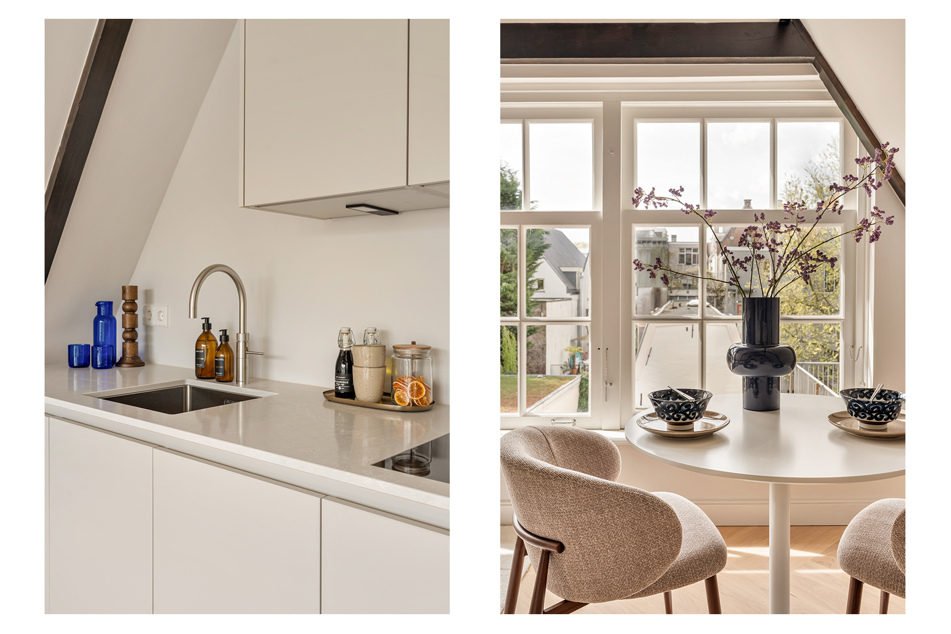 Upon entering the living area, the open and bright layout immediately stands out. The wide windows at the front allow plenty of natural light to flood in and give the space a spacious feel. The living room offers ample opportunities to create a comfortable seating area, while there is also room to set up a sleeping area. The open kitchen is centrally located in the space and serves as a natural connection between the various areas. The kitchen features a composite countertop and is equipped with various built-in appliances, including a Siemens combination microwave and dishwasher, a Bora Pure induction cooktop with integrated ventilation, a Quooker, and ample counter and cabinet space.