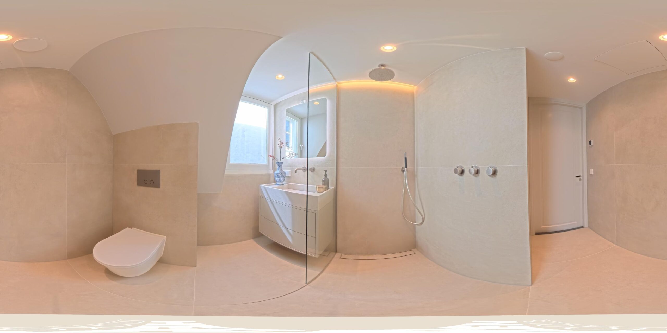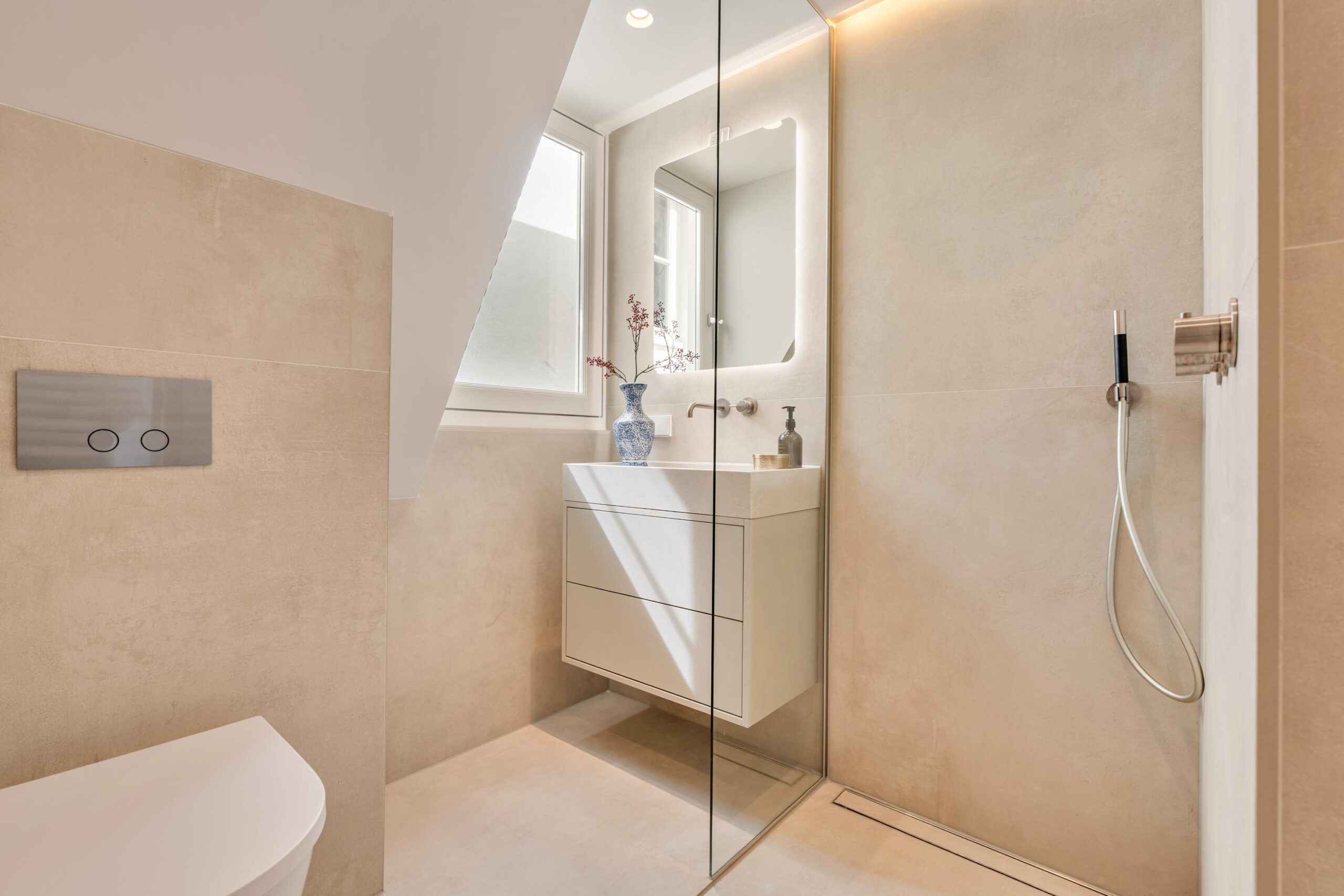 The entrance leads into the apartment’s entryway, from which you have direct access to both the bathroom and the living area. The bathroom features a practical layout and is equipped with high-quality fixtures, including a shower, toilet, and sink. Additionally, the bathroom has electric floor heating with its own thermostat, providing extra comfort.