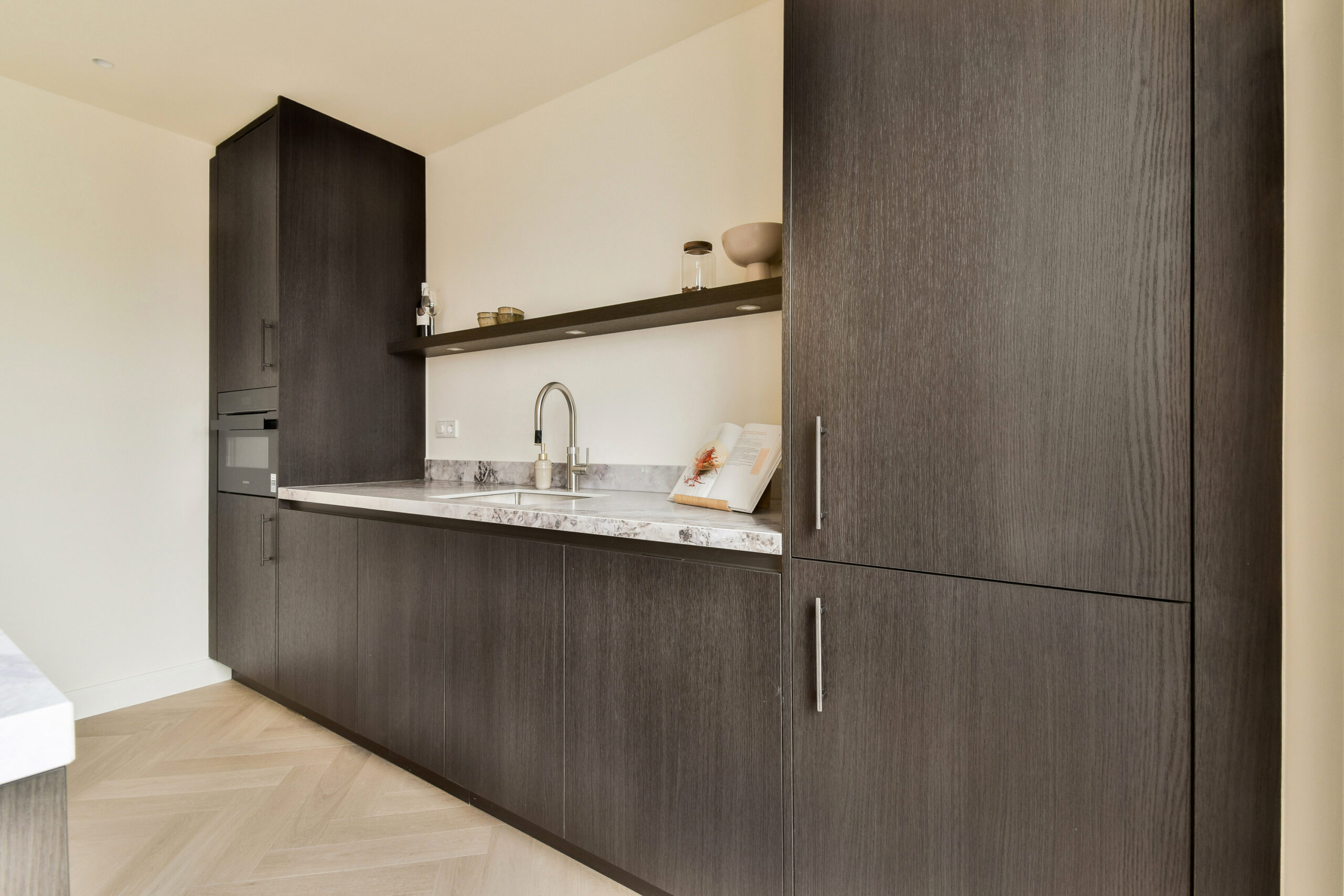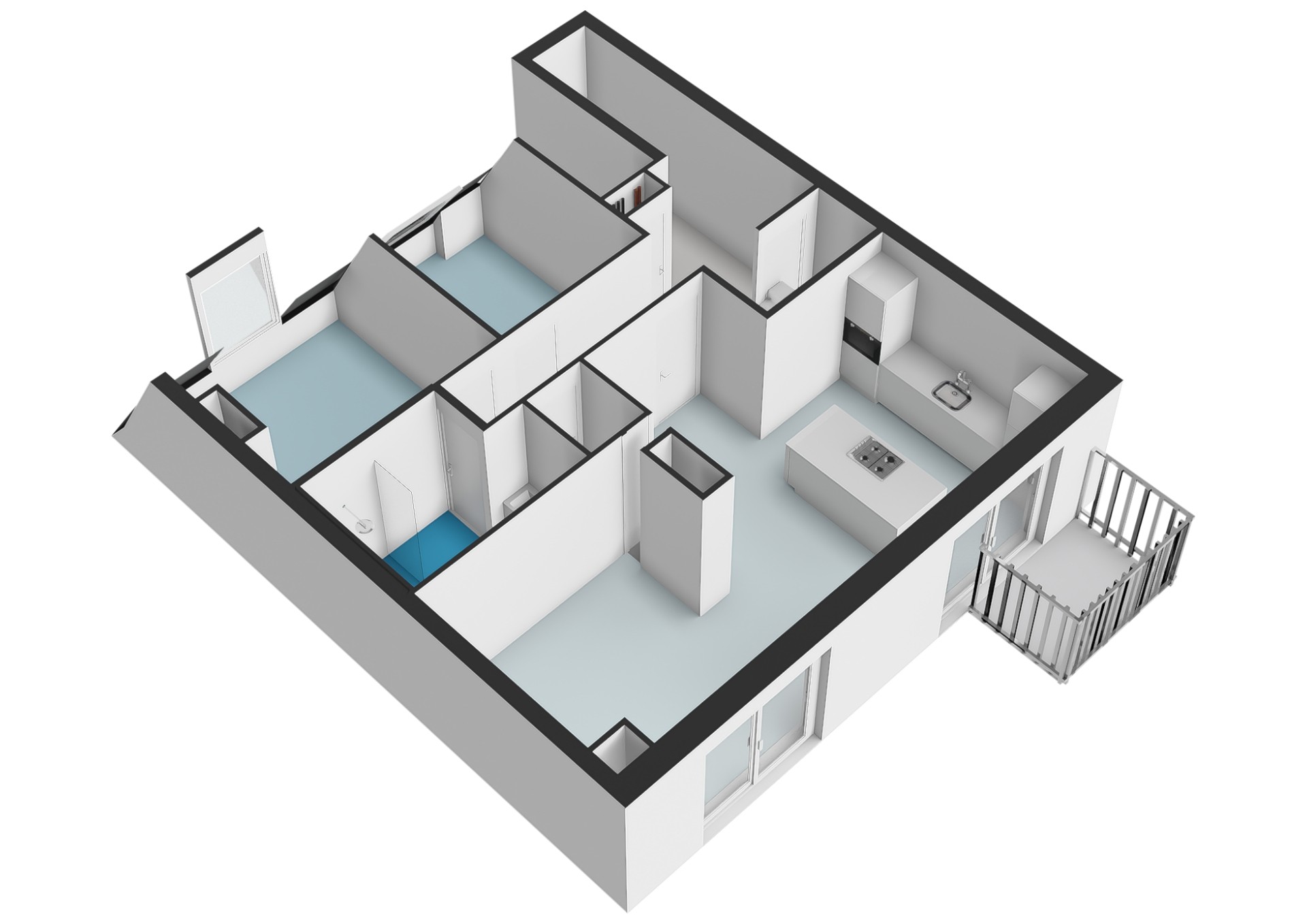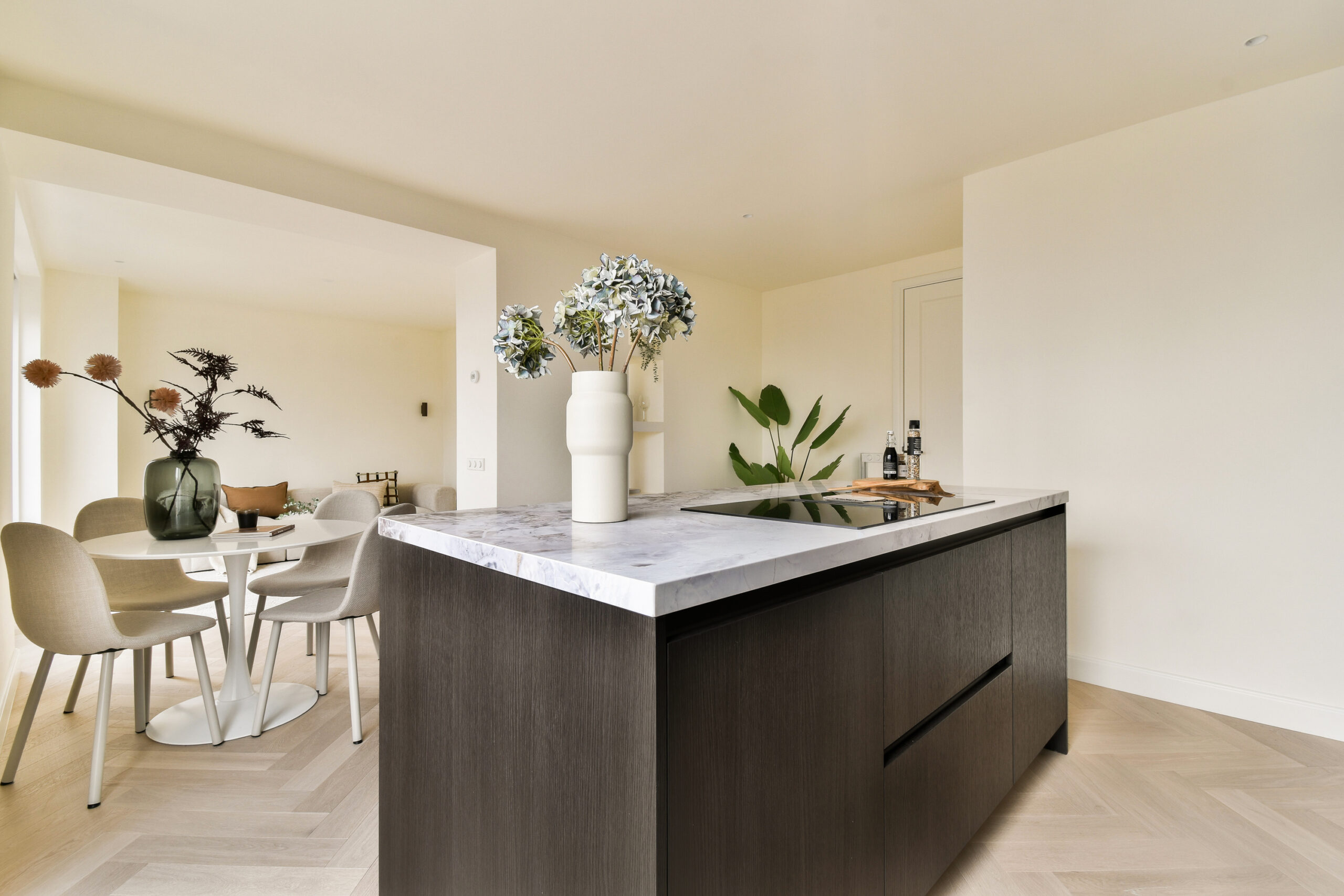 At the front of the apartment is the spacious and bright living room with an open kitchen. The living room flows seamlessly into the dining area and offers ample space for both a comfortable seating area and a large dining table. The open kitchen, located on the left-hand side, features a kitchen island and has a modern, open feel. From the dining area, you can access the balcony at the front, a pleasant spot to enjoy the outdoors.