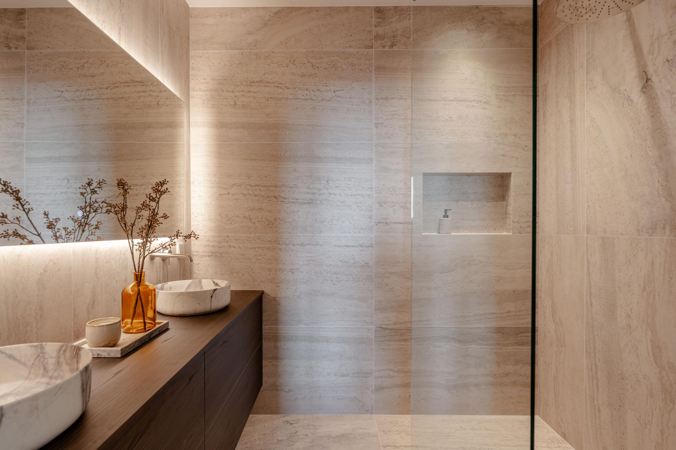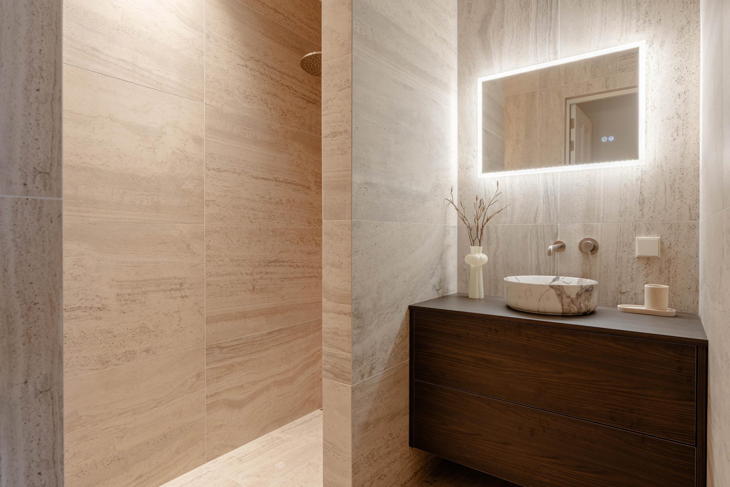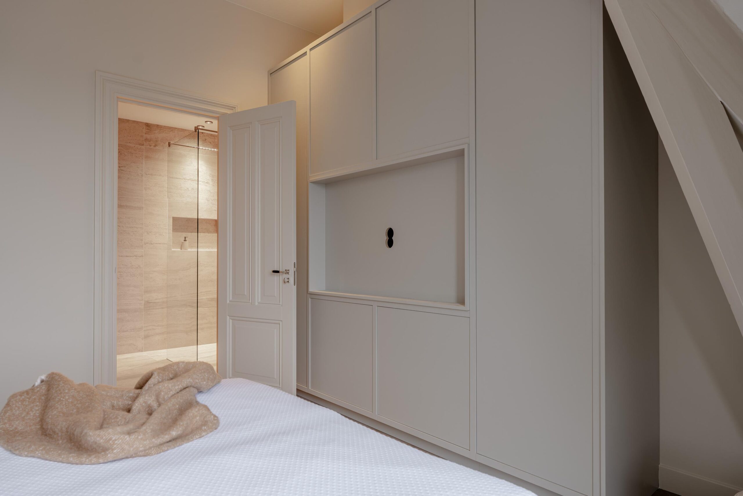 This luxurious apartment is located on the fourth floor and is characterised by a spacious and light-filled design, featuring high ceilings and striking, angled skylights at the rear. These large windows give the apartment a distinctive character and provide exceptional natural light throughout the day, along with open, green views across the city. The living room and kitchen are situated at the rear of the apartment and together form one generous living space. The unique roof structure, combined with the large skylights, creates an open and architecturally interesting atmosphere with abundant daylight and attractive sightlines. There is ample space for both a comfortable seating area and a large dining table. The luxurious kitchen is finished in a sleek and timeless design and integrates seamlessly with the living area. It is equipped with an induction hob, sink with Quooker, combi oven, climate cabinet, dishwasher, separate refrigerator and freezer, and offers generous workspace and storage capacity. At the front of the apartment are two well-proportioned and quietly located bedrooms. The master bedroom features an en-suite bathroom fitted with a walk-in shower and a double washbasin with vanity unit. Centrally located on the landing is the second bathroom, also equipped with a walk-in shower and a washbasin with vanity unit. In addition, there is a separate toilet and practical built-in storage. The roof terrace is accessible via an internal staircase. This spacious terrace offers a high level of privacy and has been structurally prepared for the installation of a jacuzzi, including a double electrical group. Provisions have also been made for an outdoor shower (water connection) and for the installation of an outdoor kitchen (water and electricity connections), making this outdoor space a valuable extension of the living comfort.