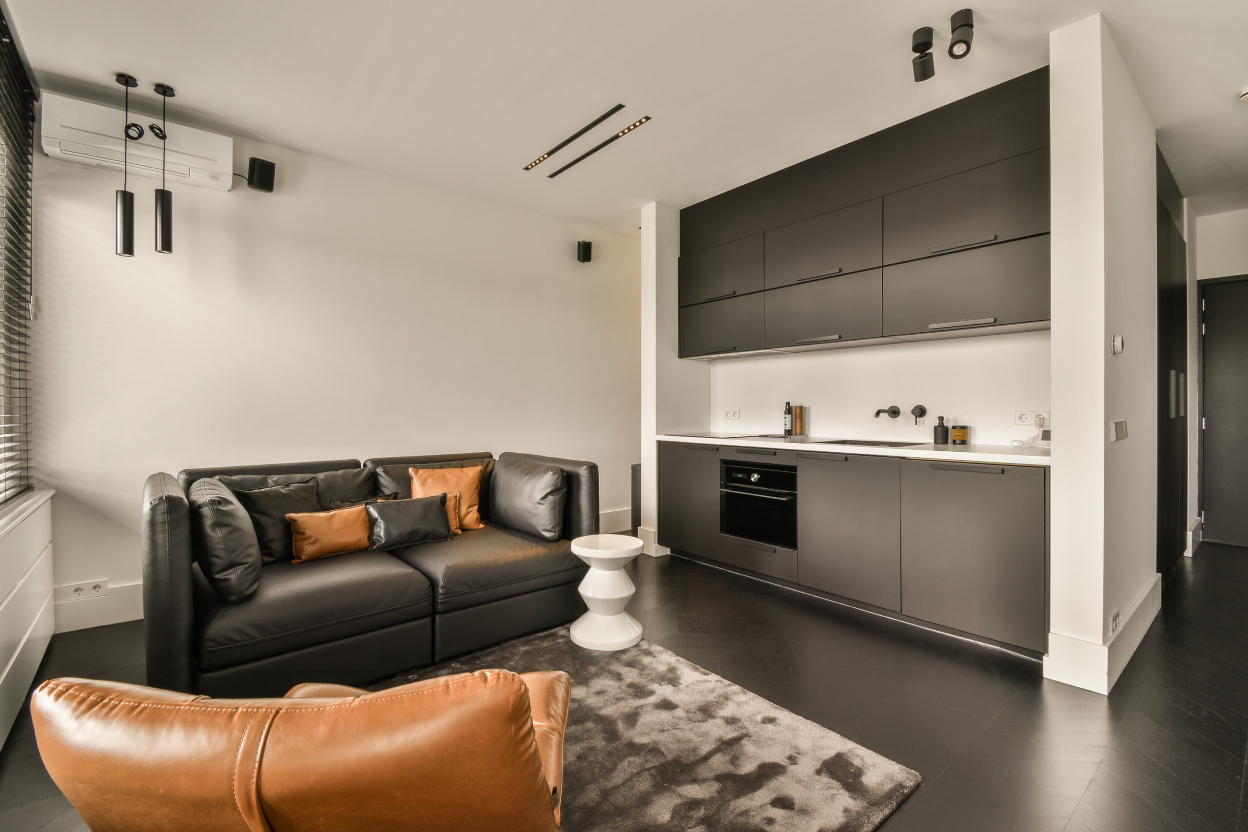 Entrance hall with ample built-in storage, including a space for a washing machine, and a separate toilet with a sink. The cozy living room includes an open kitchen, a built-in dining area, and a comfortable seating area. The kitchen is fully equipped with high-end built-in appliances, including a 4-burner induction hob, oven, dishwasher, and refrigerator.