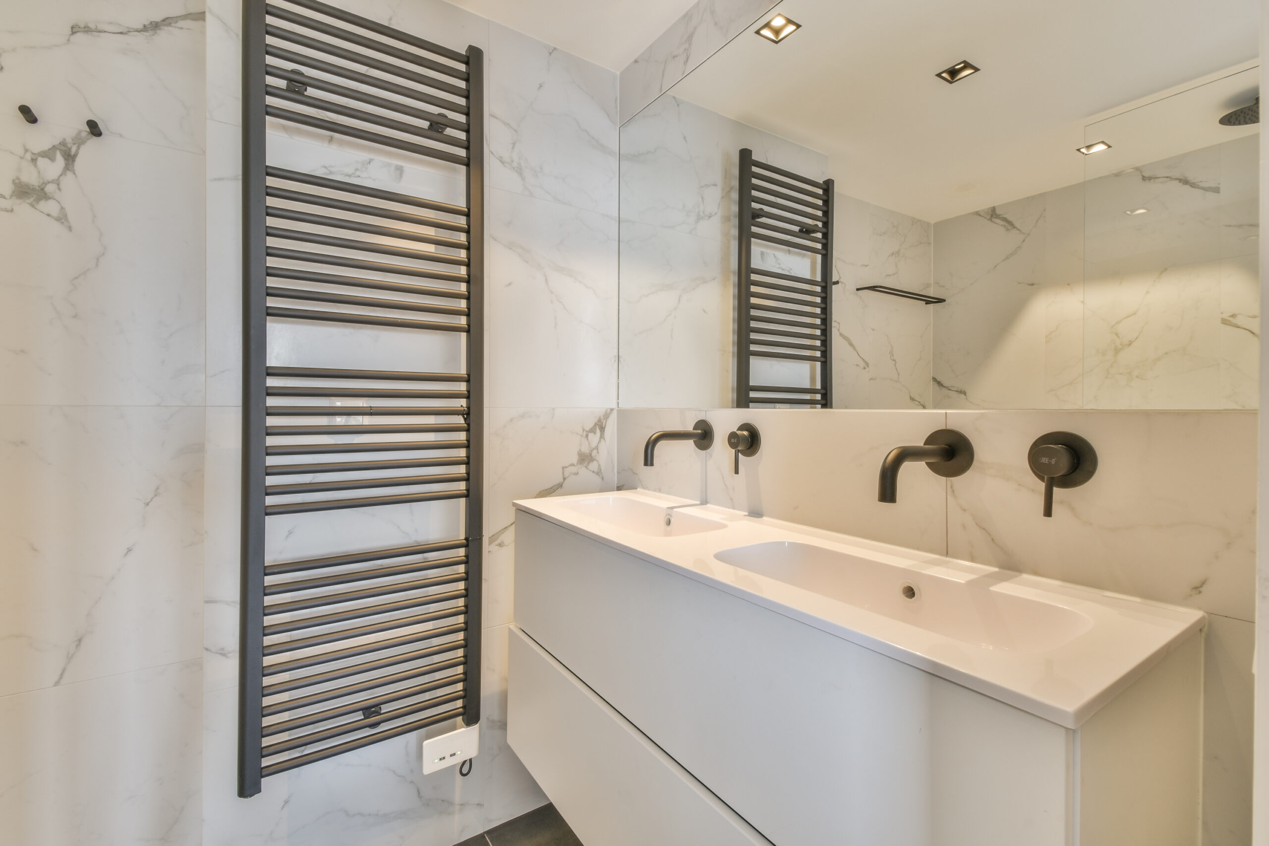 From the living room, you access the bedroom, which features built-in wardrobes. The en-suite bathroom is elegantly designed, offering a bathtub with a shower, a double vanity, and a designer radiator. The entire apartment is fitted with a stunning herringbone-patterned hardwood floor.