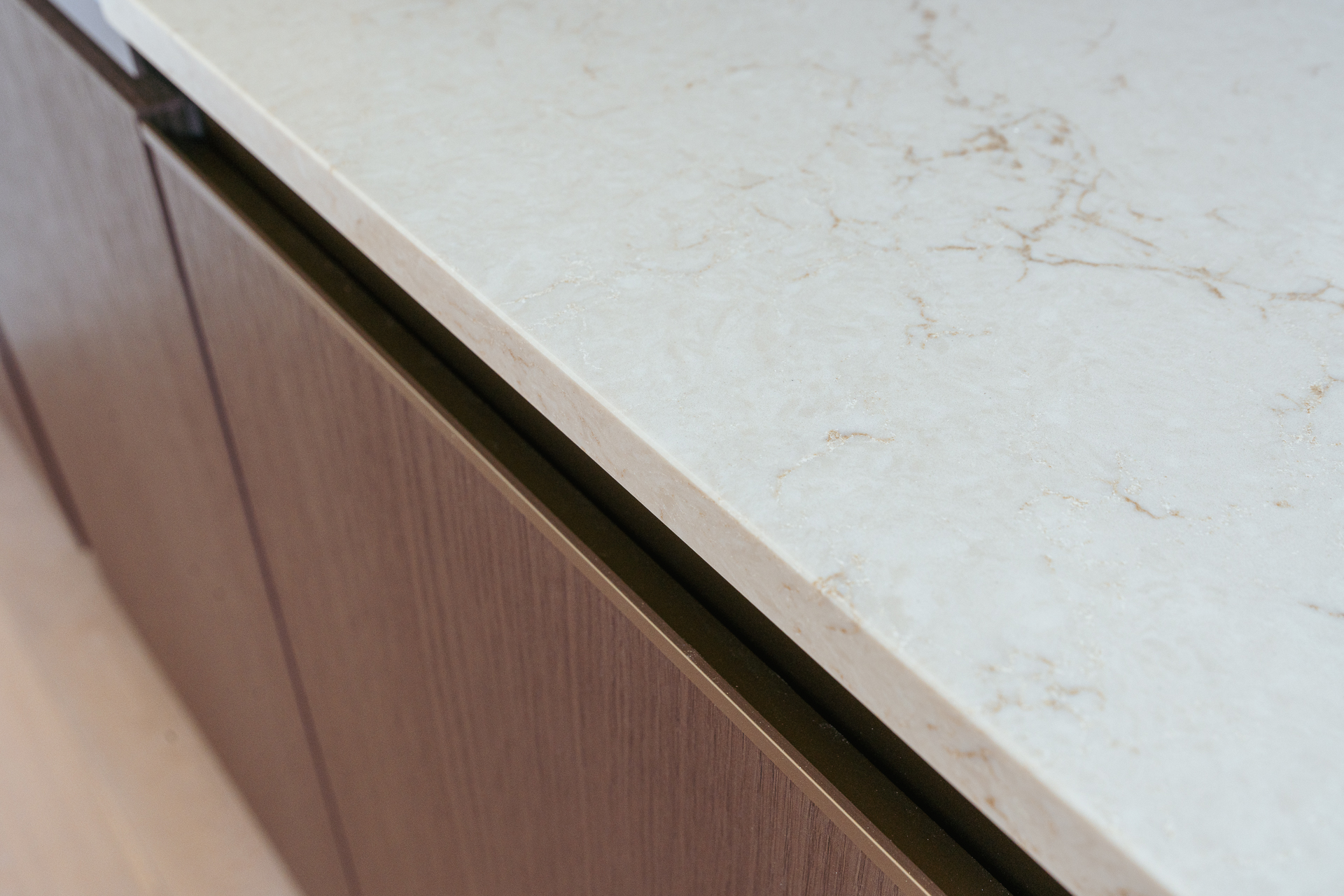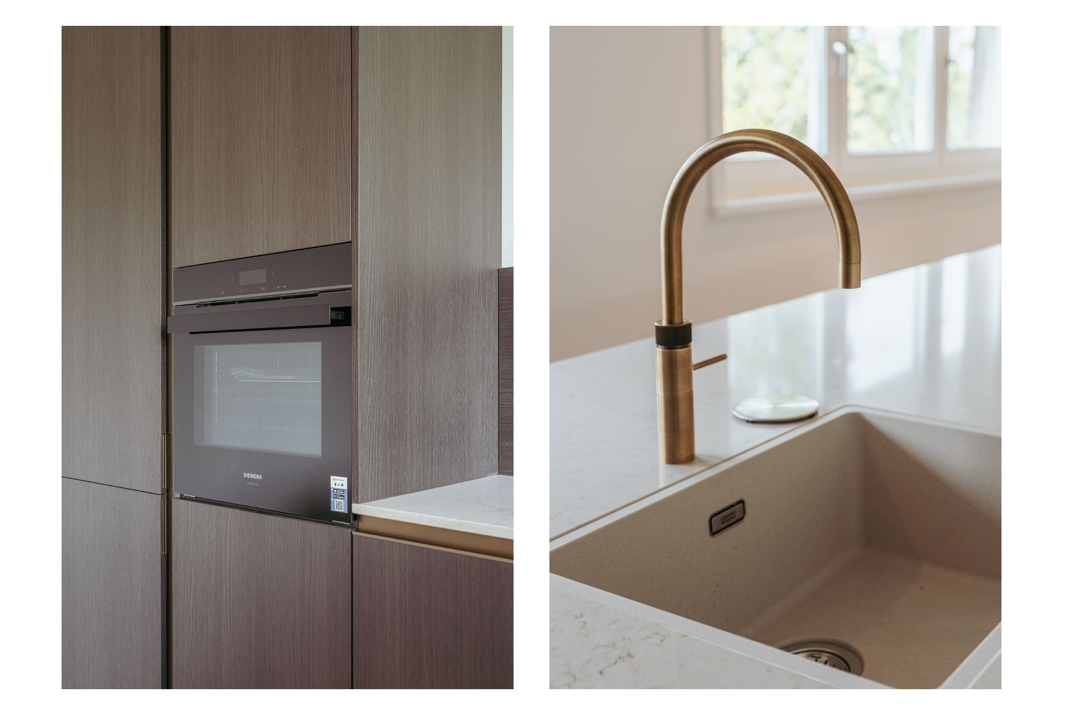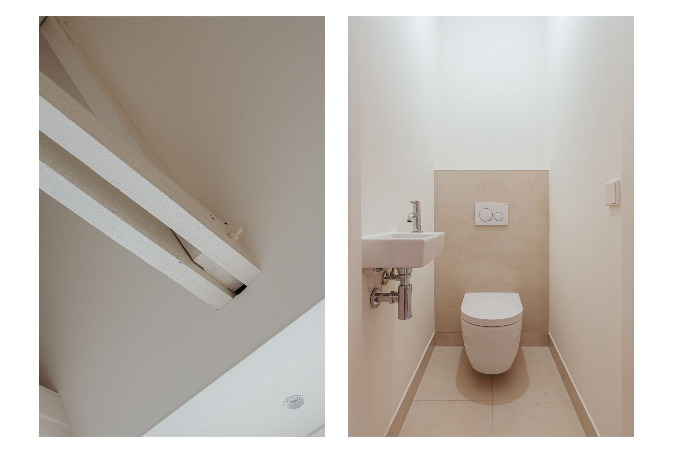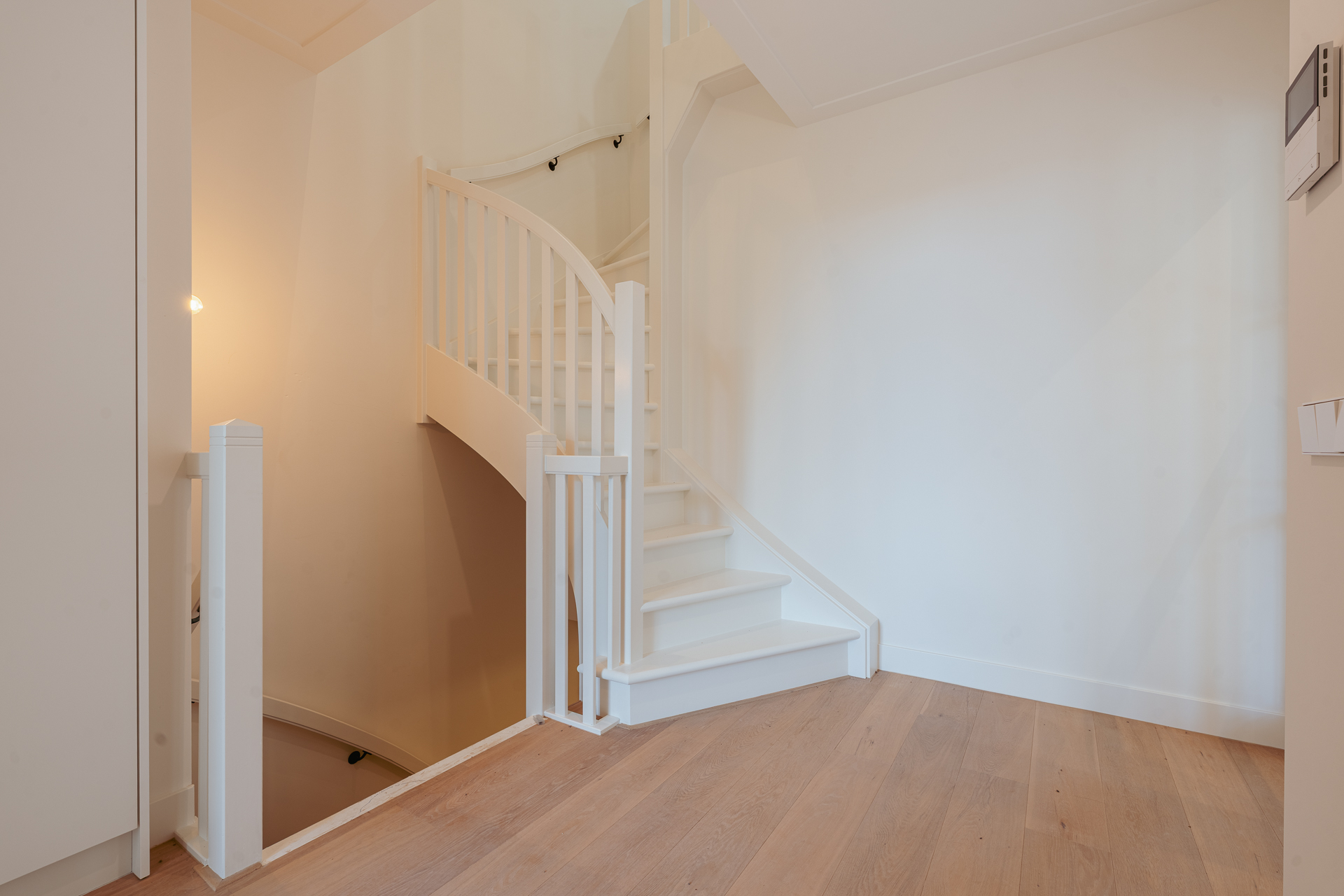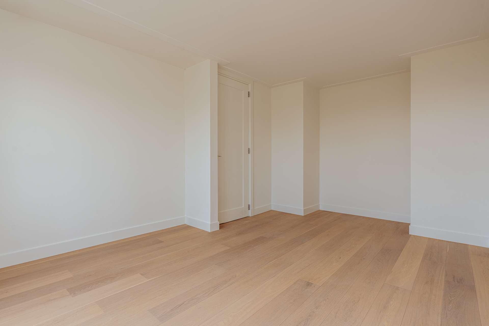 The open-plan kitchen is a true eye-catcher, fitted with high-quality built-in appliances: an induction hob with integrated extractor, dishwasher, combi-oven and Quooker tap. The combination of sleek handleless cabinetry and warm wooden accents gives this floor a modern yet inviting feel. From the living room you have access to a sunny southeast-facing balcony, perfect for a morning coffee or an afternoon drink in the sun.