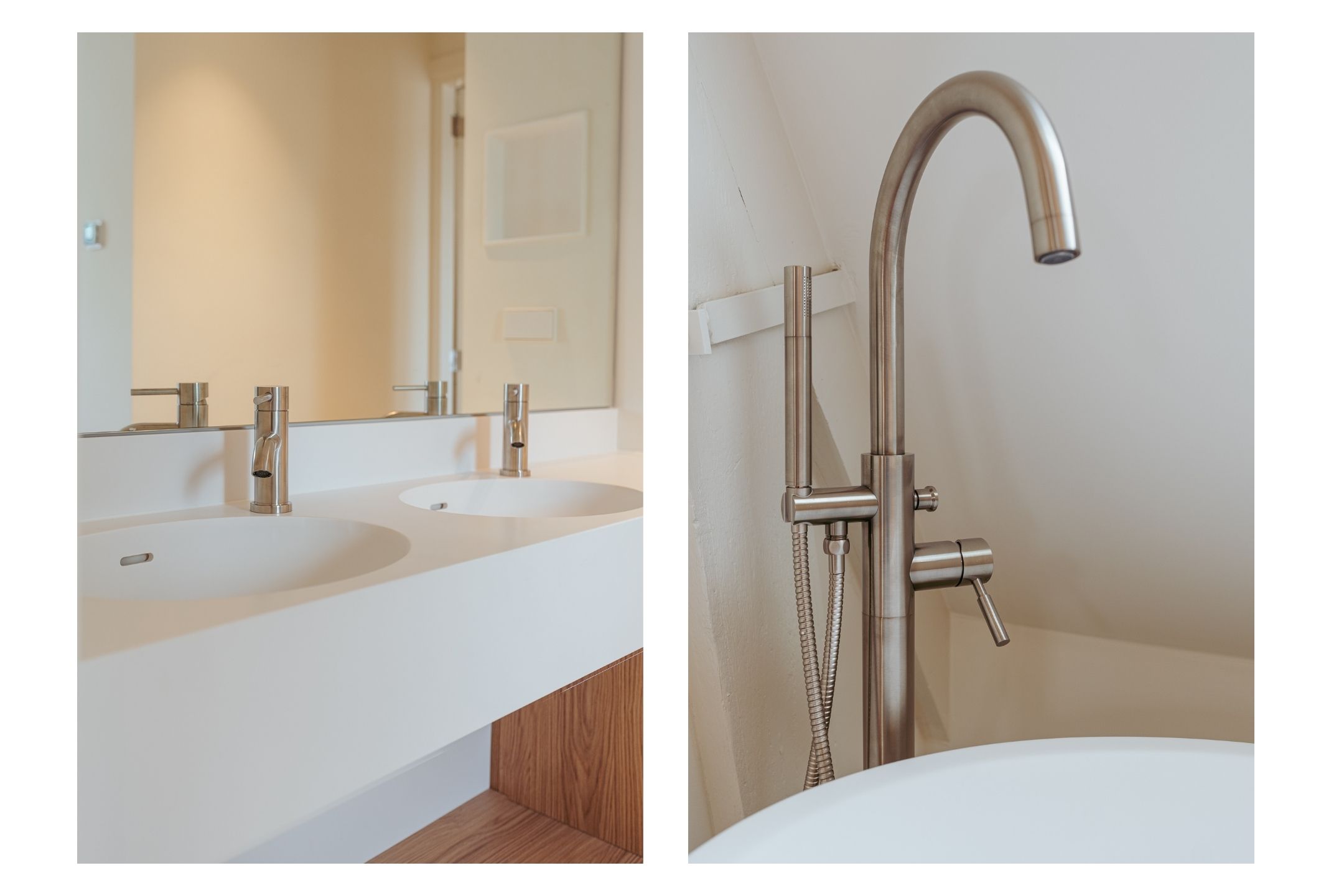 The fourth floor accommodates the master bedroom, which has French doors opening onto a delightful terrace running the full width of the property—an ideal spot to enjoy the sun and the view in peace. At the rear you’ll find a second bedroom, also with access to the terrace. The modern bathroom is fully equipped with a bathtub, shower and double washbasin. On this floor you will also find a separate WC, a practical laundry room for washing machine and dryer, and additional storage space.