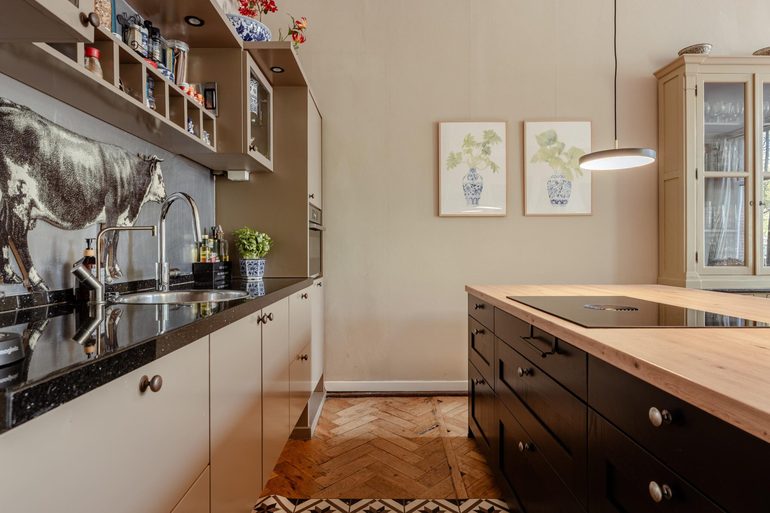 At the front is the spacious living room with high ceilings and large windows, flooding the room with natural light and offering beautiful views over the canal. The living room has ample space for both a seating and dining area and, together with the adjoining open kitchen, forms the heart of the home. The kitchen features a central cooking island and various built-in appliances, ideal for extensive cooking and entertaining.