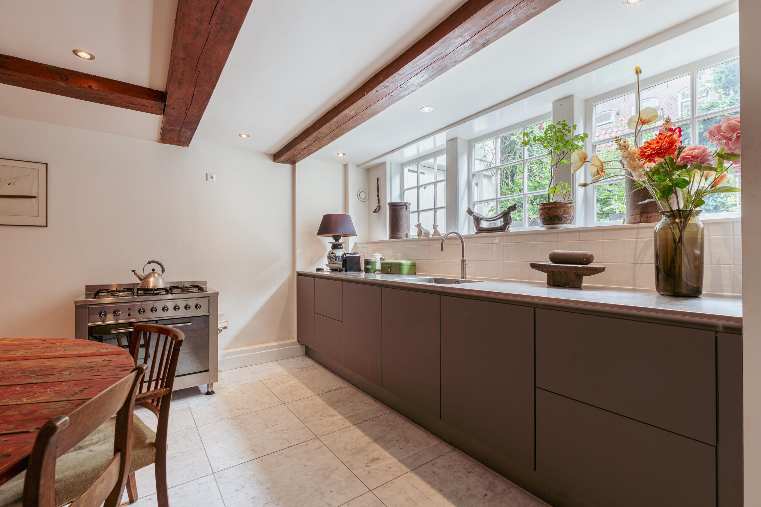 At the front of the apartment is a spacious room, ideal as a home office or separate dining room. This room also has its own private entrance from the communal hallway. At the rear is the living room overlooking the inner garden. Both rooms feature characteristic wooden beams and high windows, creating a pleasant influx of daylight.