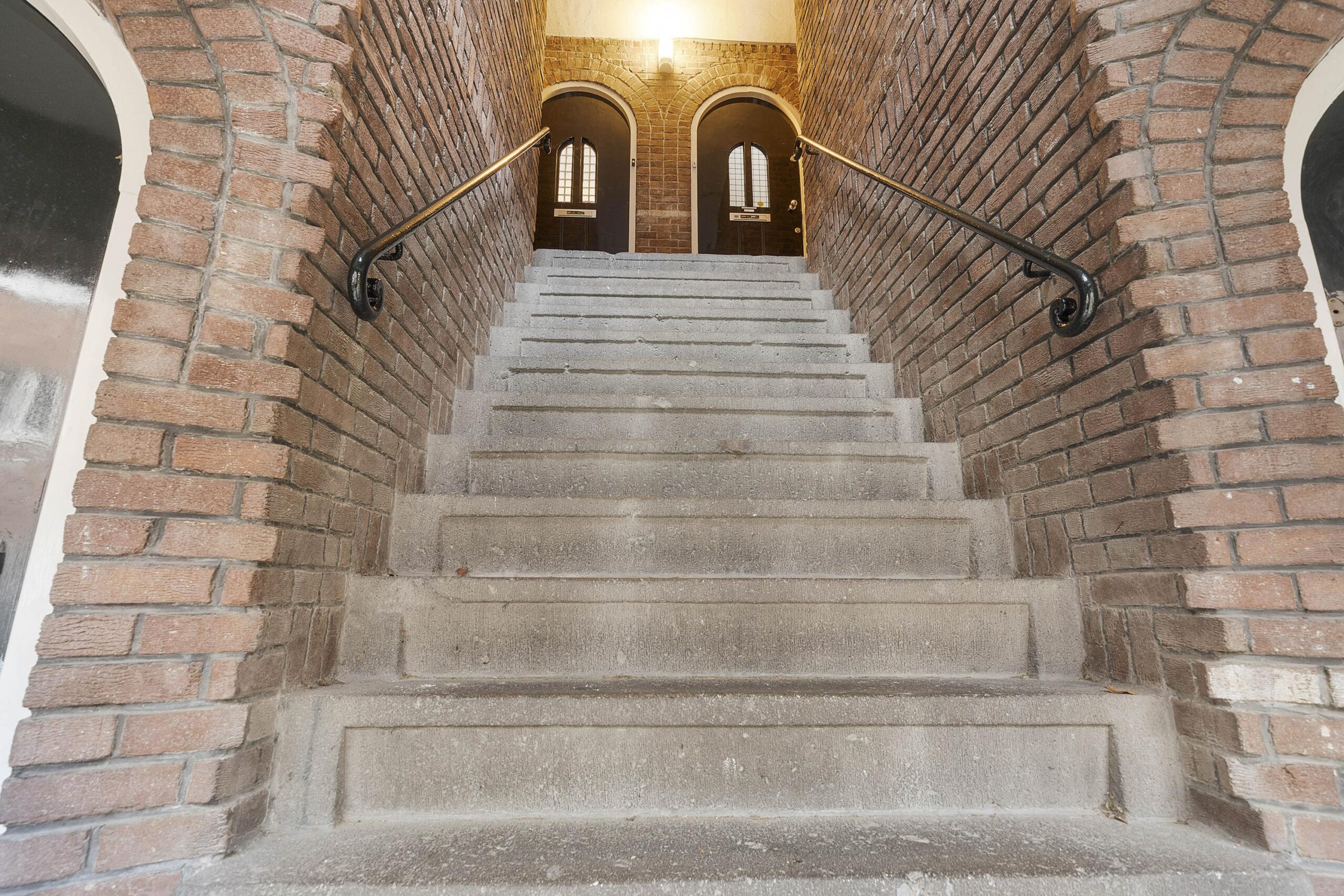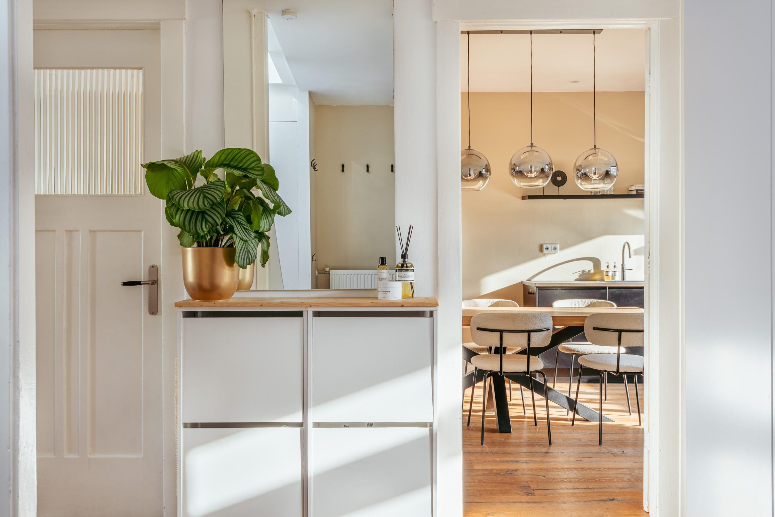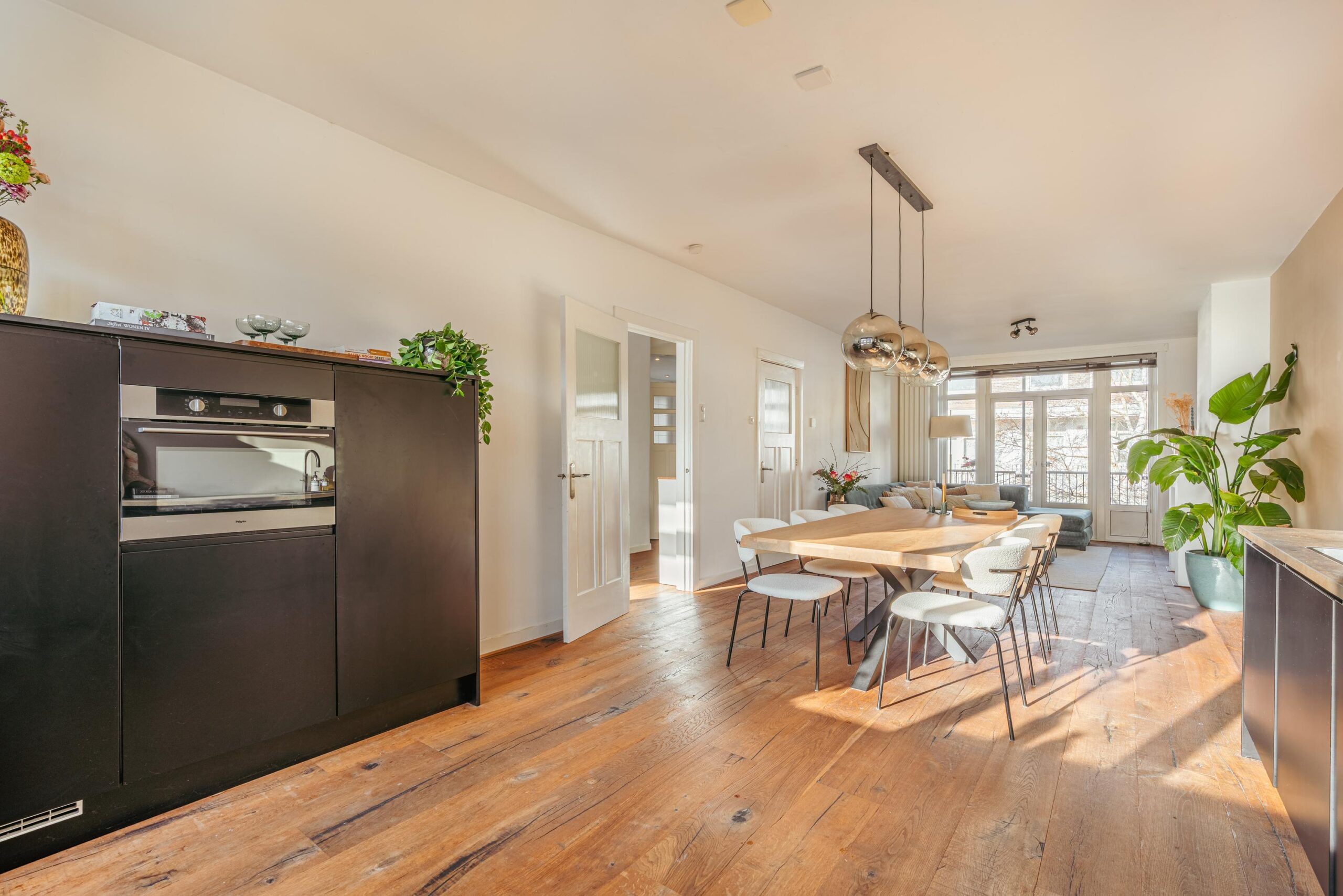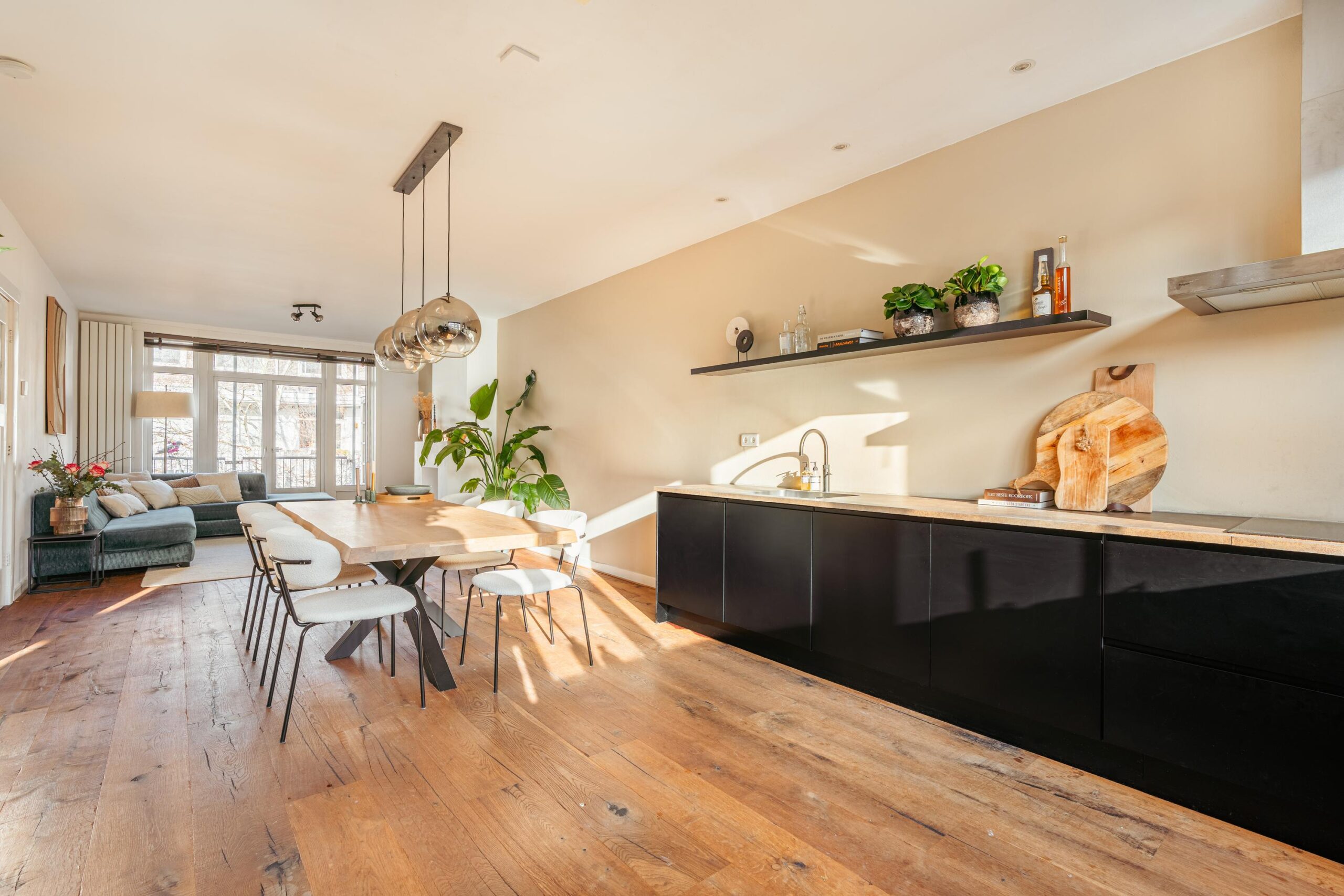 The private entrance leads to the hallway of the apartment on the second floor, from which all rooms are accessible. The generous living area with open-plan kitchen spans the full depth of the apartment and benefits from large windows at both the front and rear. This results in beautiful natural light and a wonderful sense of space. At the rear, double French doors open onto the balcony. The living room easily accommodates a comfortable seating area as well as a spacious dining area. The characteristic fireplace adds charm and creates a warm, atmospheric focal point. The open-plan kitchen is well finished and practically designed, featuring high-quality built-in appliances, including a 4-burner induction cooktop with extractor, dishwasher, fridge/freezer combination, combi oven, and a Quooker.