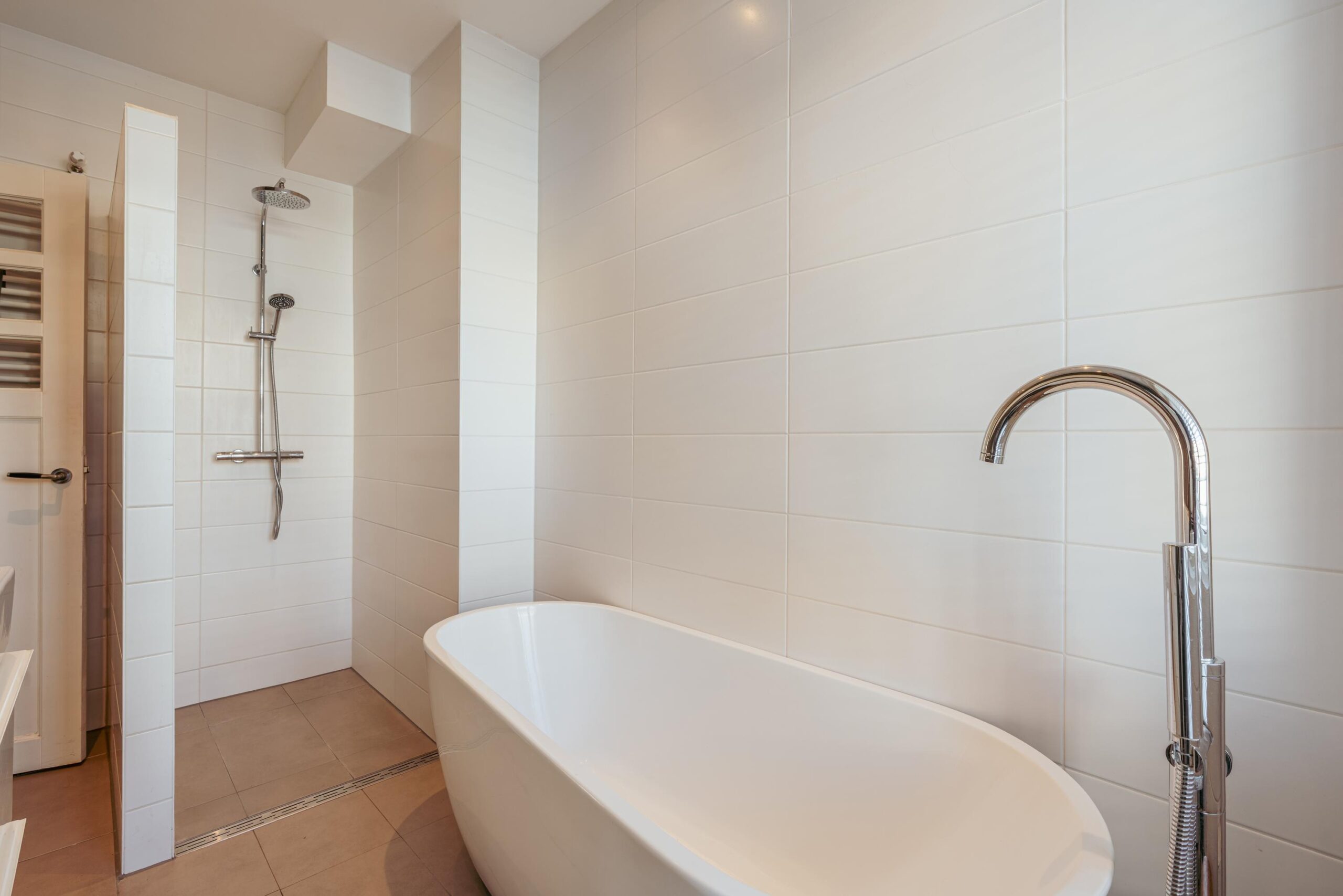 The master bedroom is located at the front and features a custom-made, very spacious built-in wardrobe and French doors opening onto the front balcony. The second bedroom is situated at the rear and also provides access to the balcony; this room is equally suitable as a home office or guest bedroom. The bathroom is luxuriously finished and equipped with a generous freestanding bathtub, walk-in shower, and double washbasin with vanity unit. Connections for a washing machine and dryer are also located here. A separate toilet is situated off the spacious landing.The apartment is well insulated and even includes 7 solar panels, ensuring low energy costs. It has an energy label B. As mentioned, the property has its own private entrance and front door, offering additional privacy.