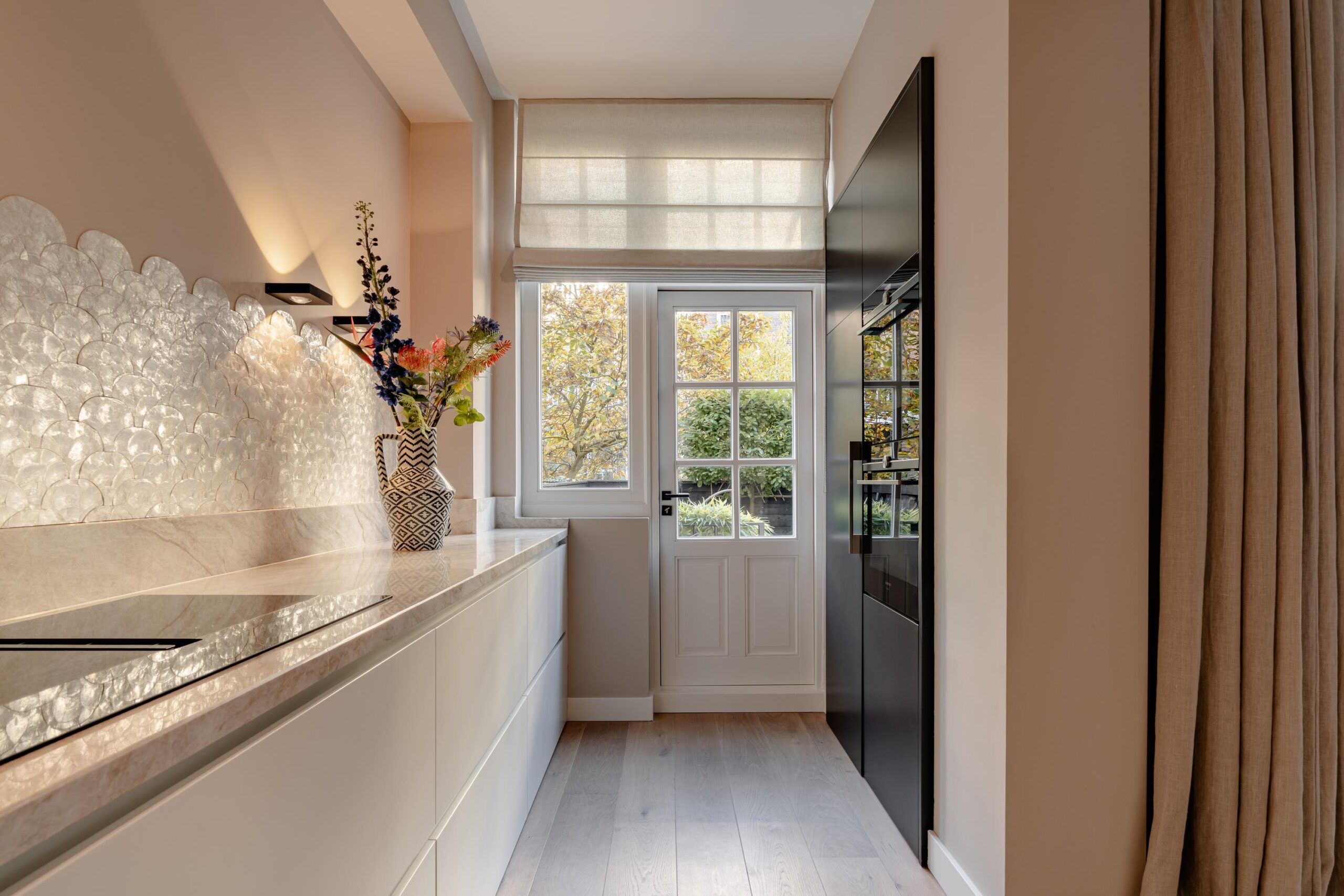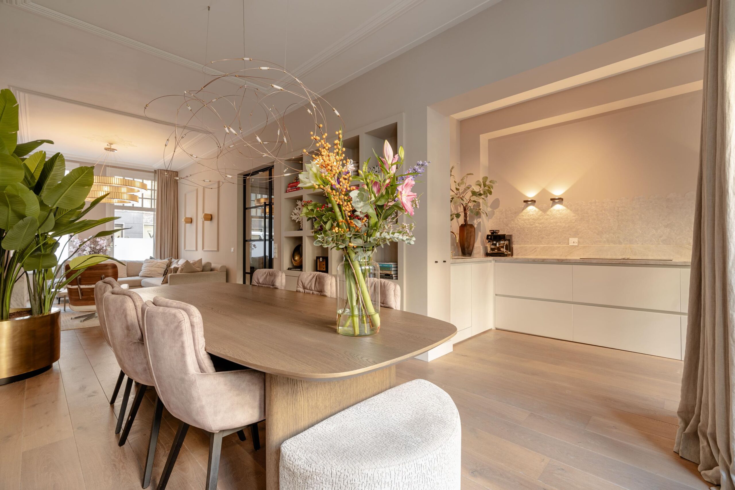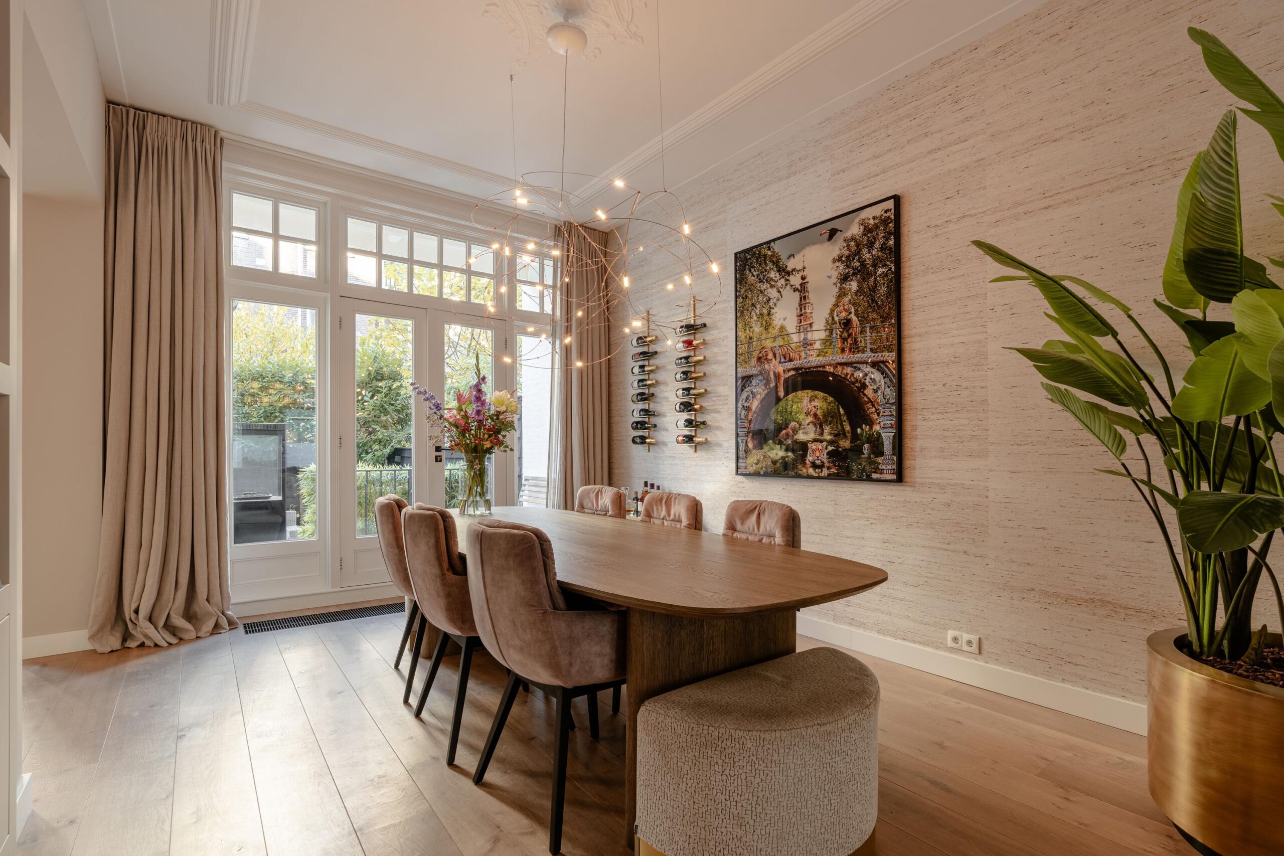 The modern kitchen is situated at the back and is equipped with an induction hob with integrated extraction, refrigerator, freezer, oven, combi-oven, dishwasher and a sink with Quooker tap. Both the kitchen and dining area provide access to the terrace through French doors. From the terrace, a staircase leads down to the spacious rear garden, a delightful outdoor area with plenty of room for lounge seating, a dining table and a safe play space for children.