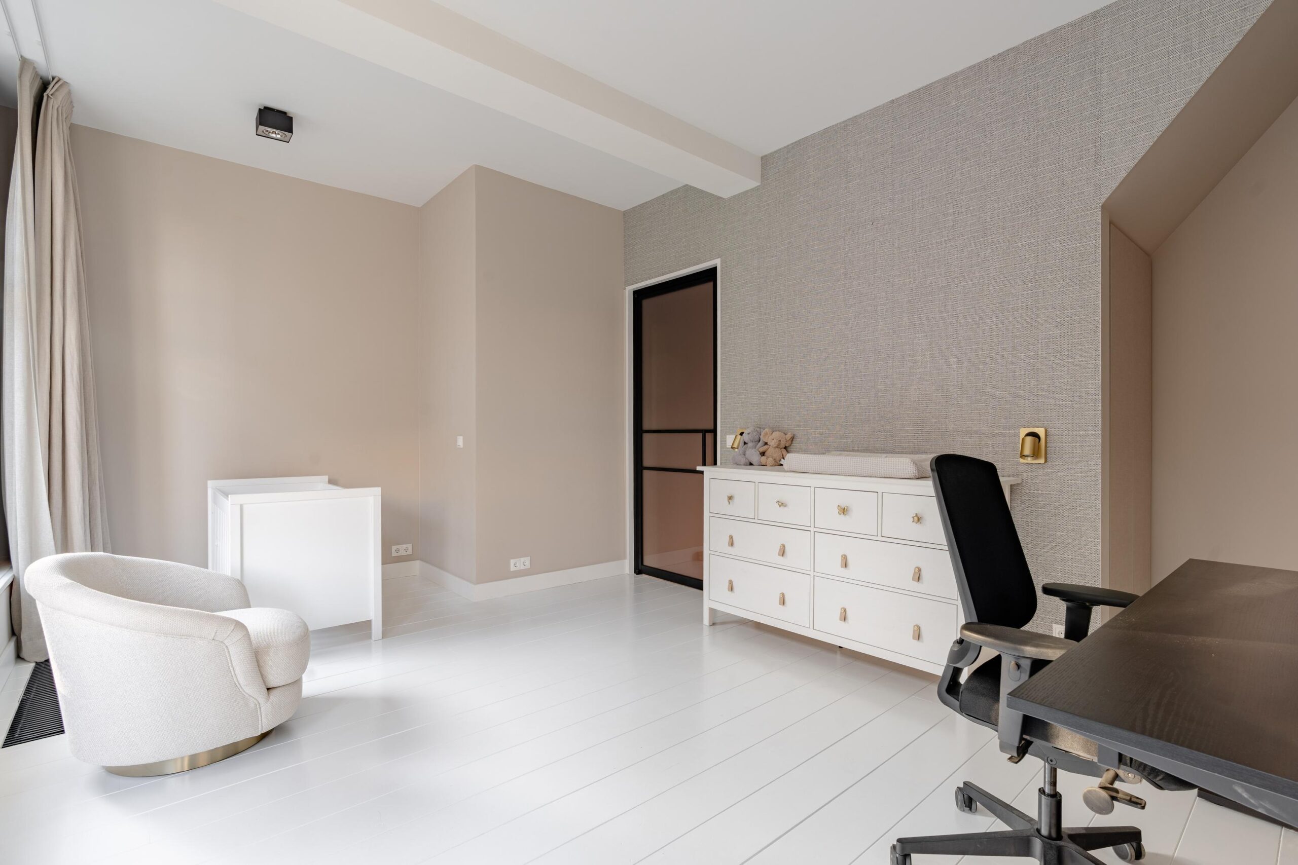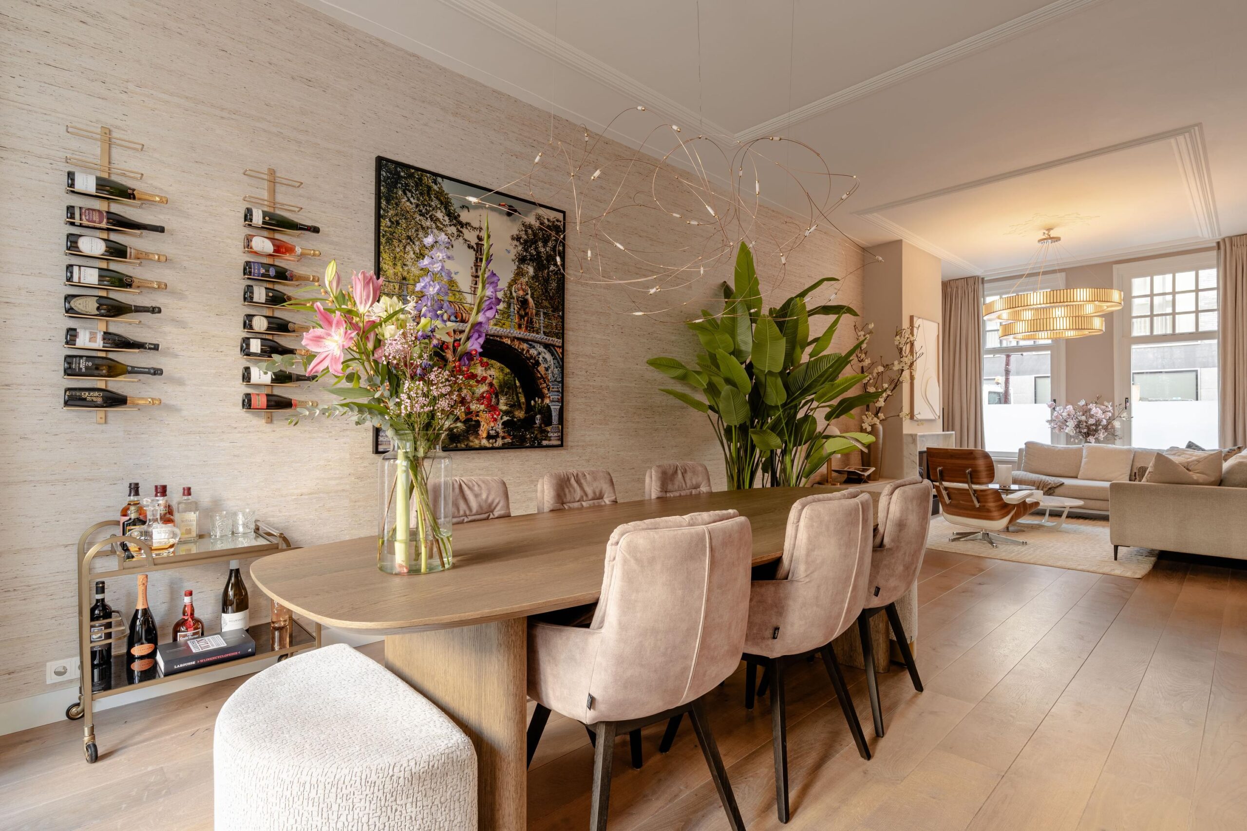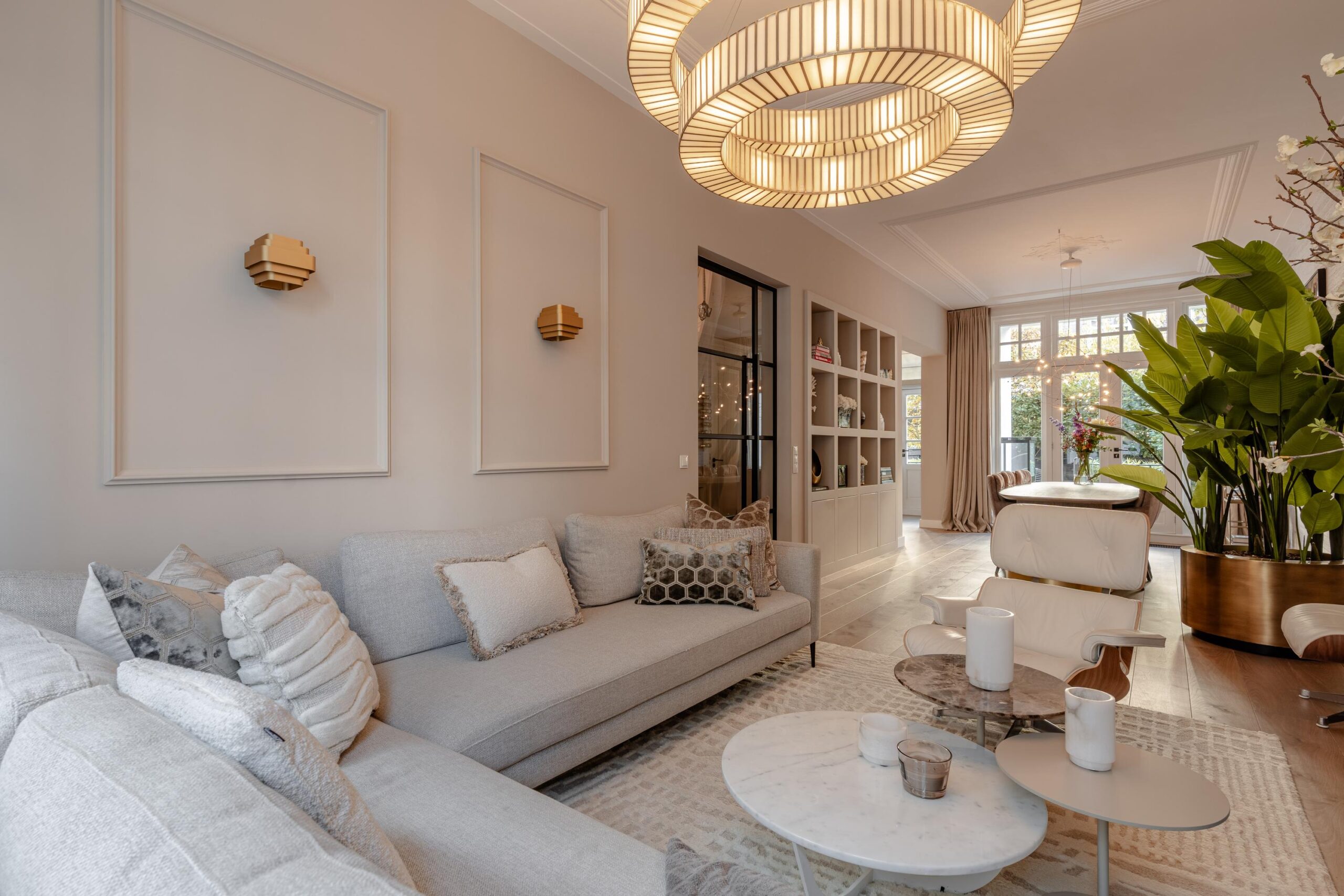 The modern kitchen is situated at the back and is equipped with an induction hob with integrated extraction, refrigerator, freezer, oven, combi-oven, dishwasher and a sink with Quooker tap. Both the kitchen and dining area provide access to the terrace through French doors. From the terrace, a staircase leads down to the spacious rear garden, a delightful outdoor area with plenty of room for lounge seating, a dining table and a safe play space for children.
