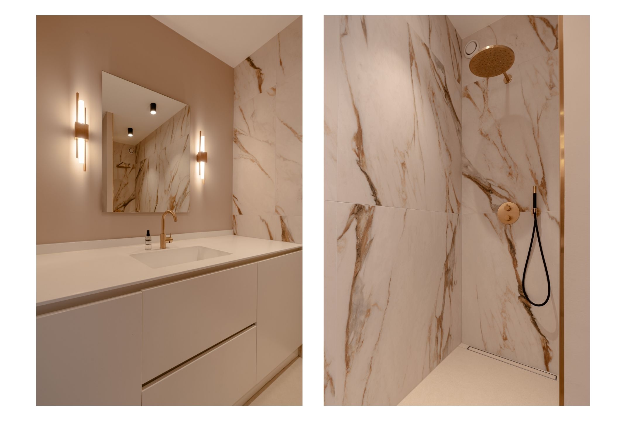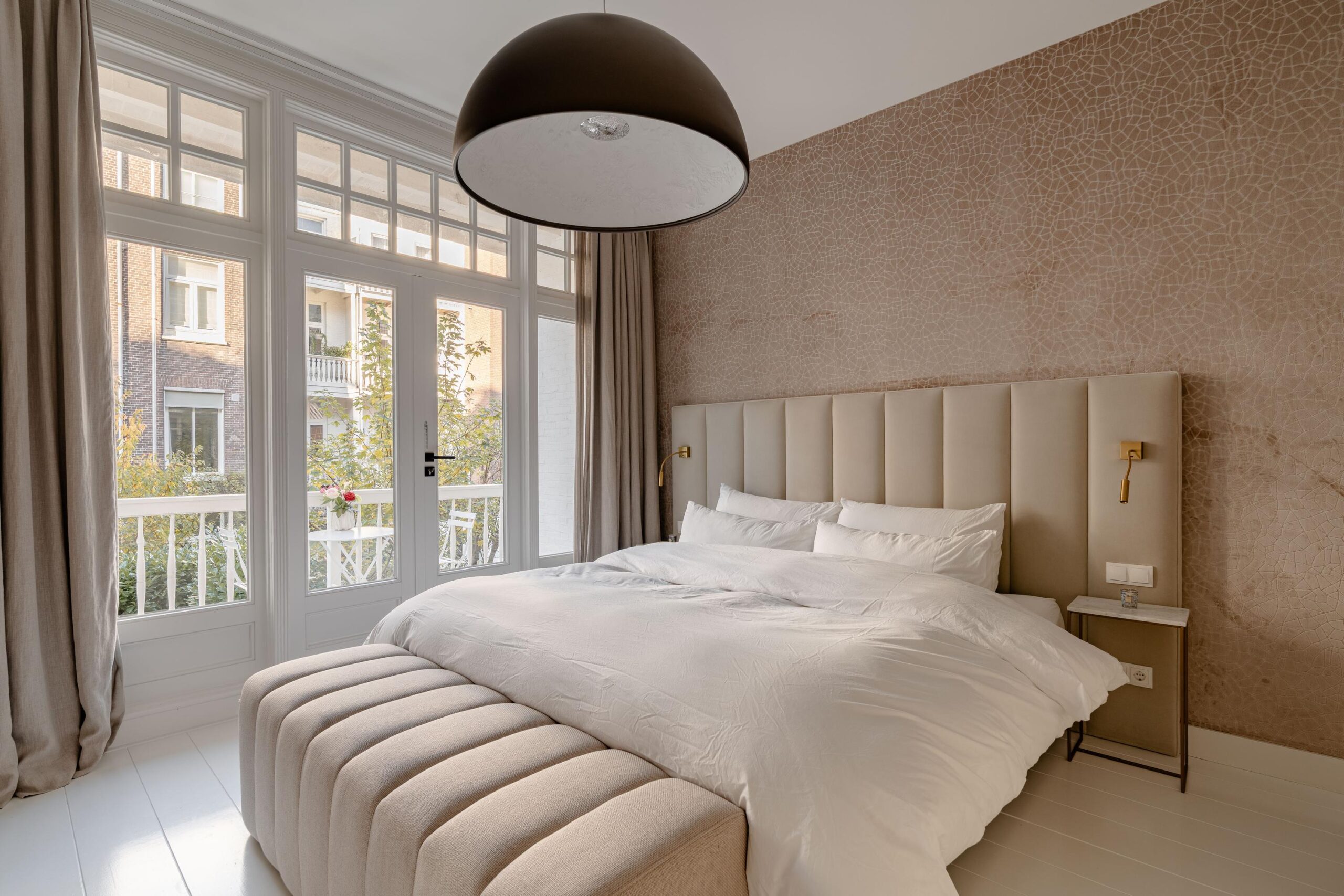A staircase leads to the first floor. The central landing gives access to two bedrooms and the luxurious bathroom. At the front is a bedroom fitted with neat built-in wardrobes and a charming bay window, complete with custom-made cushions to create a cosy seating nook. At the rear is the master bedroom, also featuring built-in wardrobes and air conditioning, with direct access to a balcony overlooking the green inner gardens. The bathroom on this floor is fully finished in the same style as the other sanitary spaces and includes a double shower, double washbasin with cabinet, bathtub and toilet.