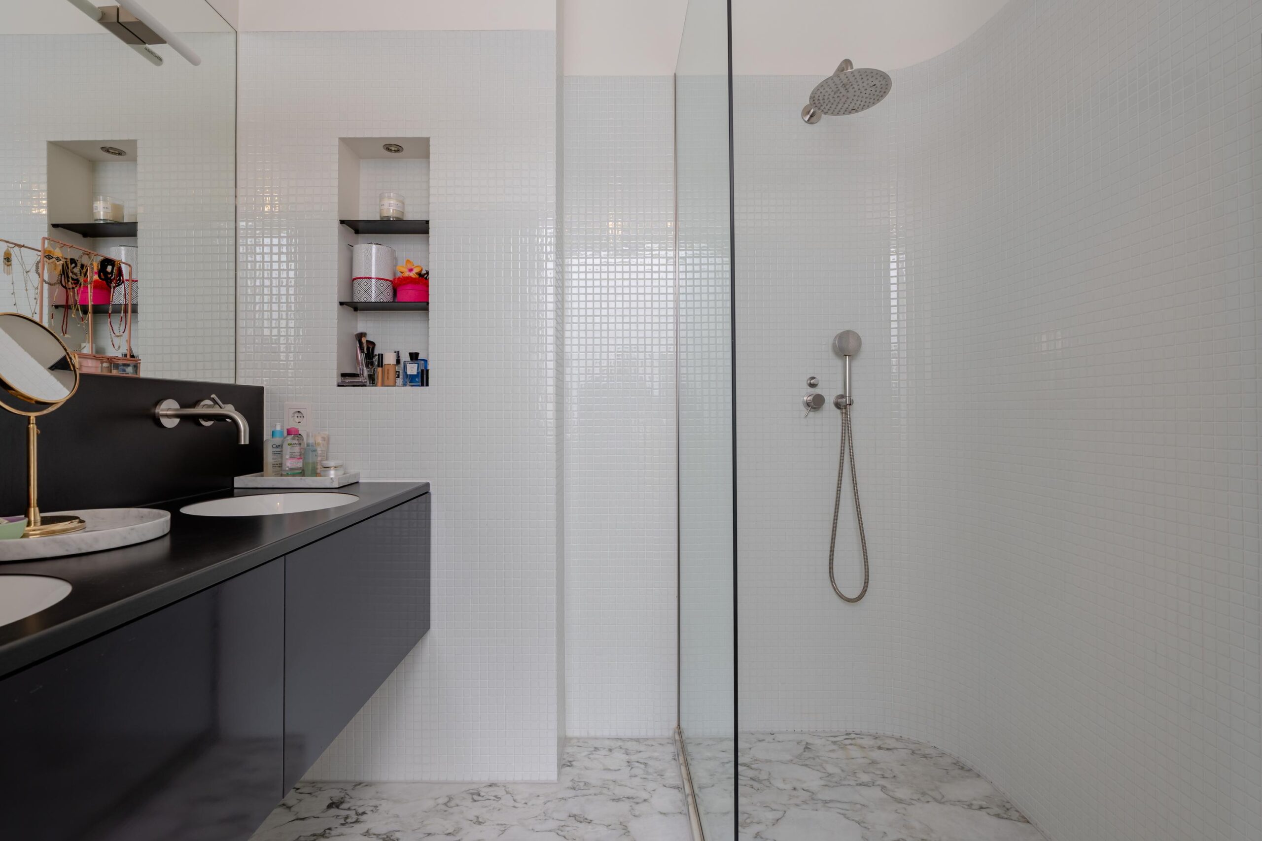 The third floor offers two spacious rooms: one bedroom at the front and one at the rear. Both rooms are fitted with air conditioning and can also be used as a study, guest room, or hobby space. This floor also features a second bathroom with a walk-in shower and double vanity unit. A separate toilet and a stylish mezzanine complete this level.