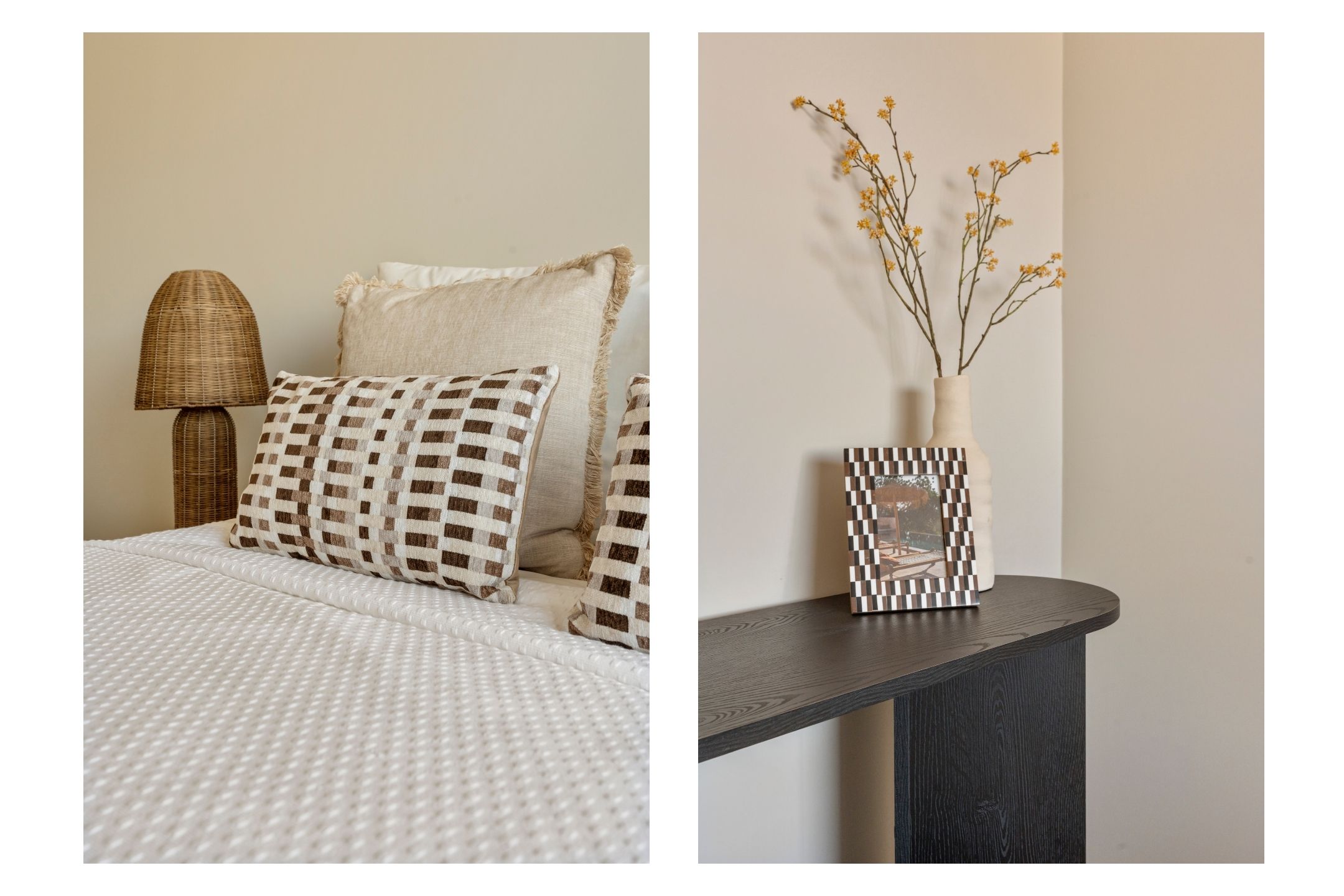 At the end of the hallway, you enter the bright living room with an open kitchen. The kitchen is fitted with built-in Bosch appliances and features a modern induction cooktop. Adjacent to the living room, on the right-hand side, are two bedrooms. The first bedroom is the spacious master bedroom, while the second room is perfectly suited as a home office or guest room.