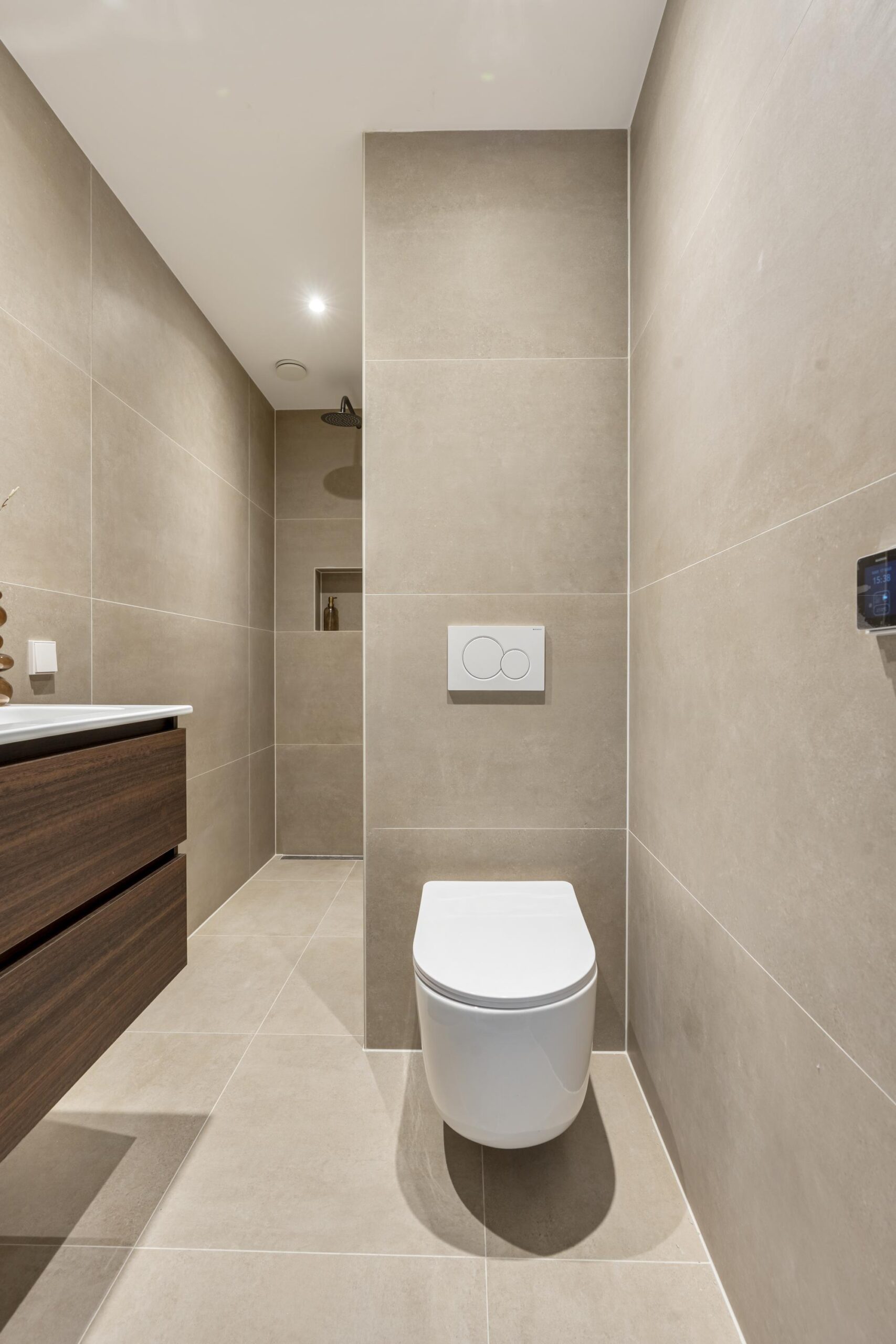Through the entrance, you enter the hallway of the apartment. On the left-hand side, you will immediately find the separate toilet. The second door on the left provides access to the bathroom, which is equipped with a double washbasin, a walk-in shower, and a practical washing machine connection in the corner.