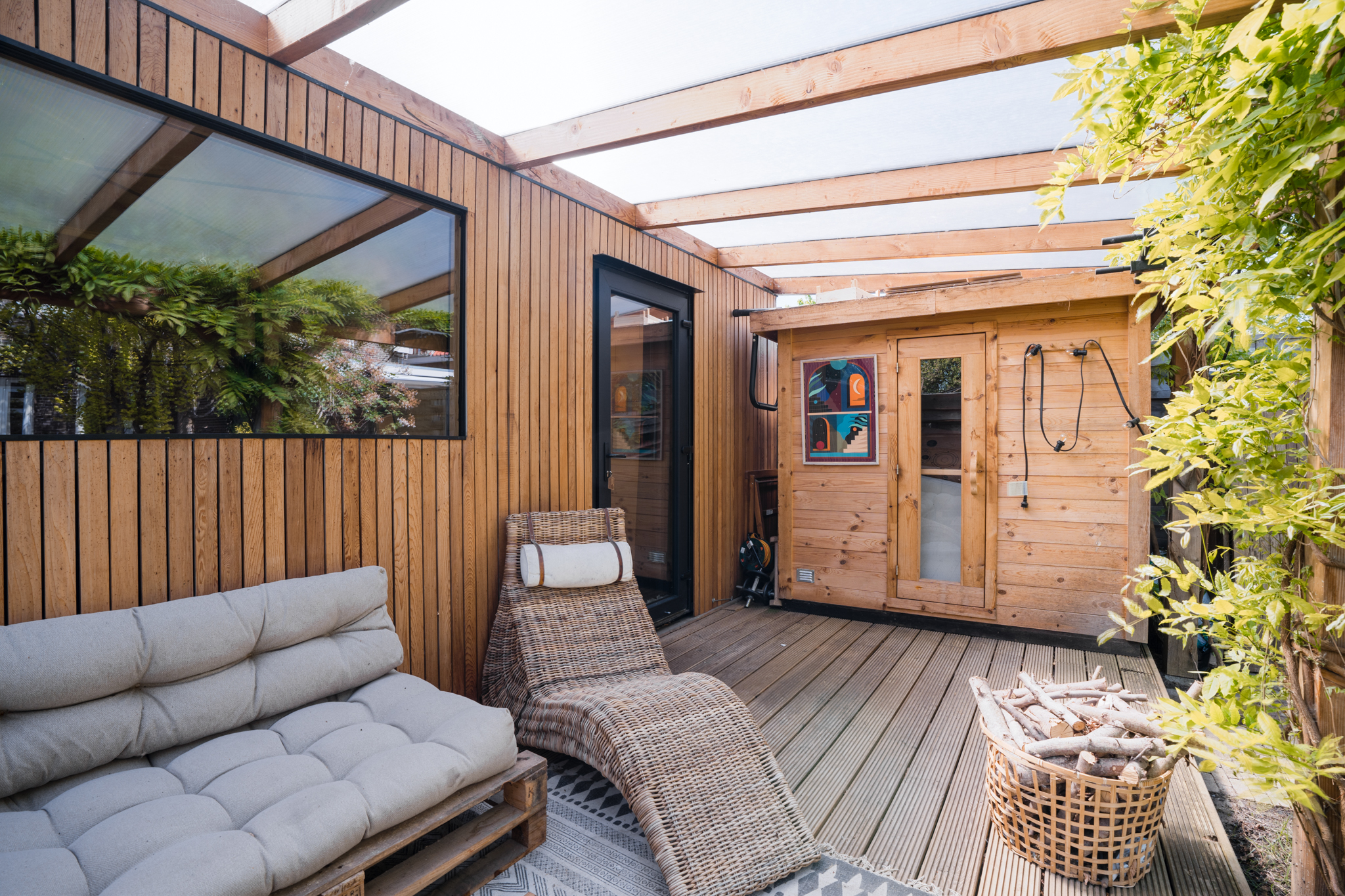 Charming semi-detached family home (approx. 104 m²) with an exceptionally deep, sunny garden (approx. 133 m²), featuring a garden house and sauna, cozy terrace, and beautifully landscaped front garden.