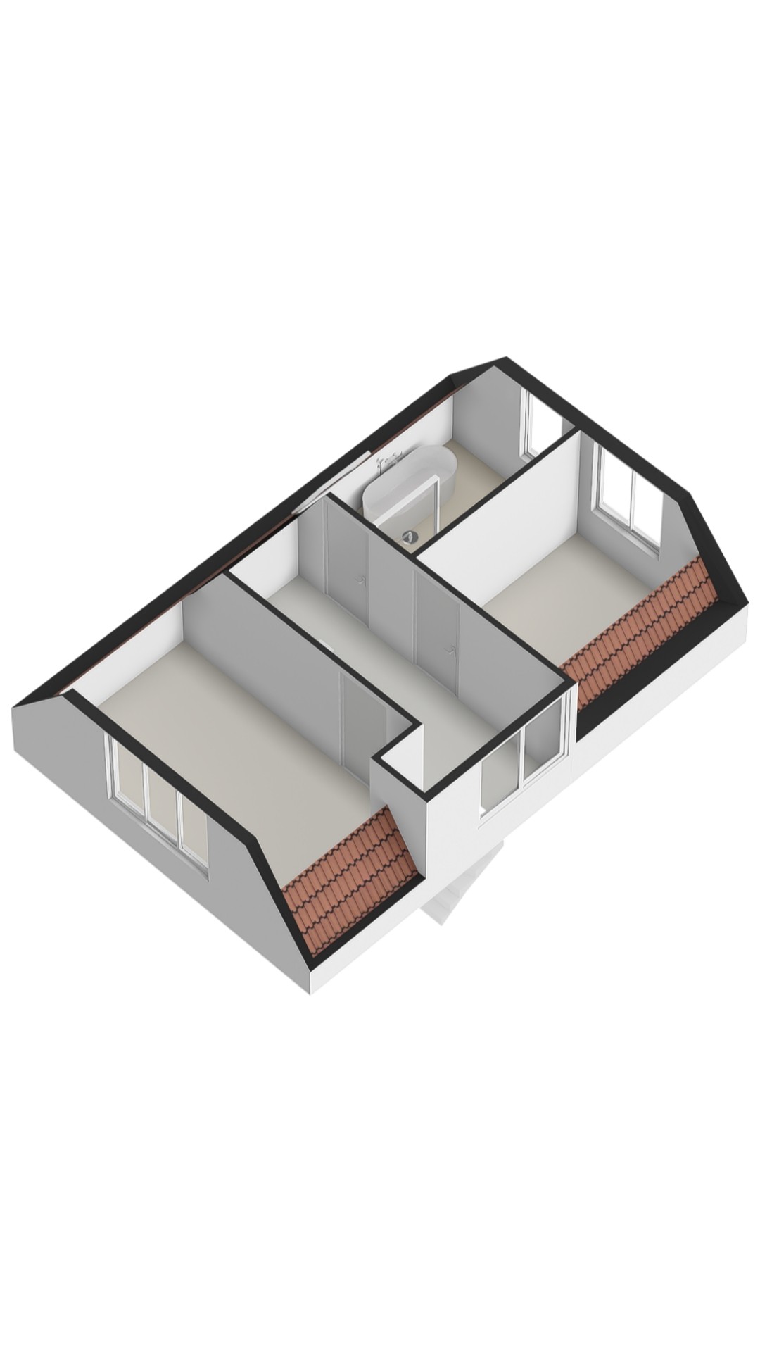 The first floor includes two generously sized bedrooms, each with large windows. The master bedroom is located at the front, while the second bedroom is at the rear. Next to this is the luxurious bathroom, featuring a bathtub, walk-in shower, toilet, and vanity with sink. A central landing provides access to the staircase leading to the second — and top — floor.